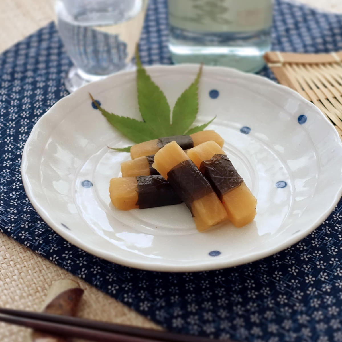 ●原材料:<しそ巻大根>大根、しその葉、漬け原材料(醤油、ぶどう糖果糖液糖、食塩、唐辛子)/酒精、調味料(アミノ酸等)、甘味料(ステビア)、酸味料(クエン酸、りんご酸)、保存料(ソルビン酸K)、着色料(黄4、黄5、赤106)、(一部に大豆・小麦を含む)