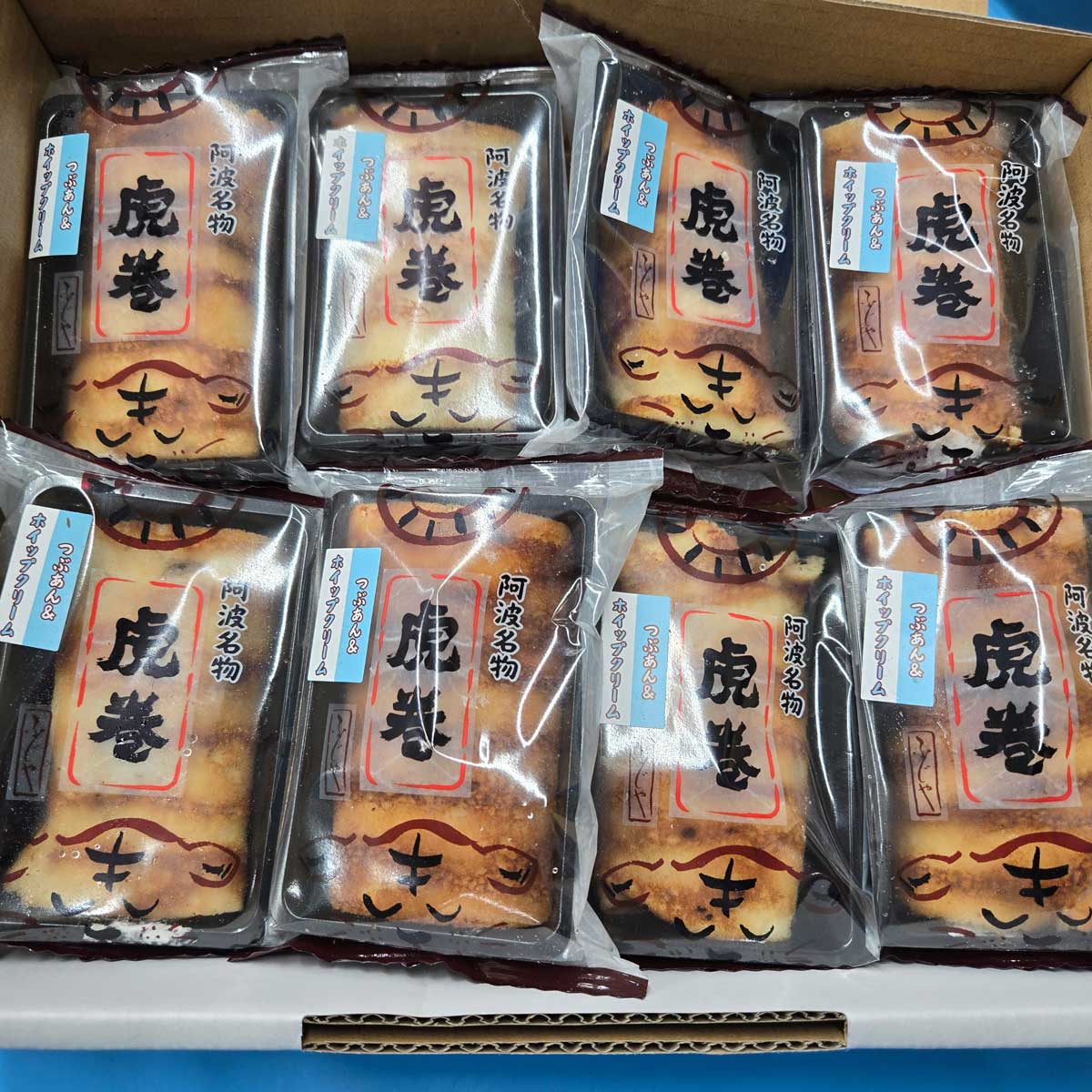 丁寧に1枚1枚手焼きした「ふじや とら巻き つぶあん&ホイップクリーム」です。カステラ生地には、国産小麦、こだわりの飼料で育てた、徳島県の農場”阿波ファーム”の新鮮卵『阿波おとめ』を使用しています。ふんわり生地にあっさり粒あんとホイップクリームがマッチ。ふわとろ食感に満足いただけます。おやつ、お茶請け、お茶菓子などとして、阿波名物とら巻きをお取り寄せでお楽しみください。