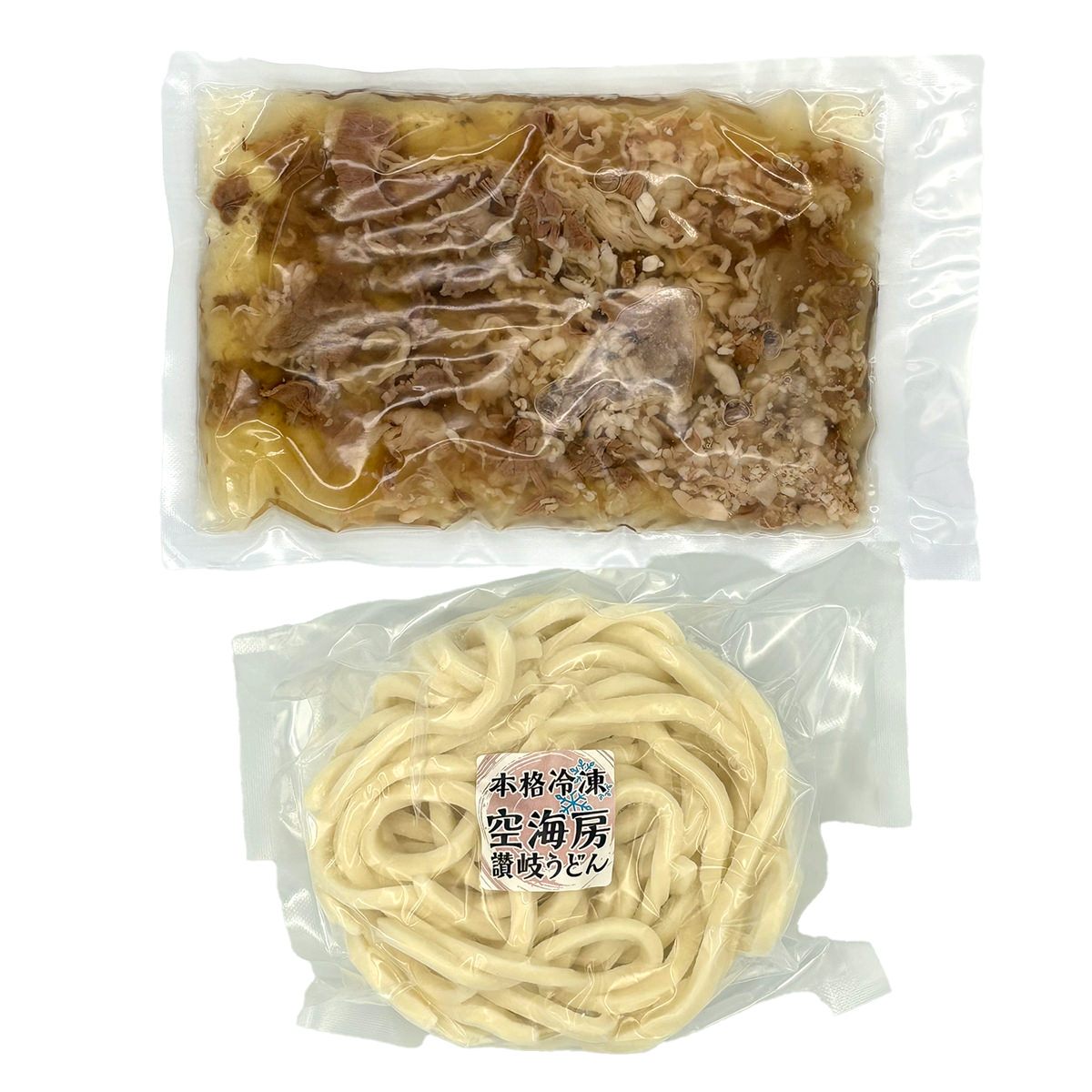 1日平均400人の香川県民が来店する「讃岐うどん 空海房」で人気上位を誇る「肉うどん 冷凍」です。肉の油抜きから煮込みまで手間暇かけて作った、空海房(くうかいぼう)でも一、二を争う人気の商品。煮込まれた玉ねぎが甘みを引き立てます。電子レンジで温めるだけの簡単調理で、いつでもどこでも手軽にお召し上がりいただけます。お好みで薬味を加えてお召し上がりください。{調理方法}うどんは袋のまま電子レンジ(600W)で6分ほど加熱、出汁は袋のまま器に乗せて電子レンジ(600W)で3分ほど加熱してください。うどんを器に移し、温めた出汁をかけてお召し上がりください。