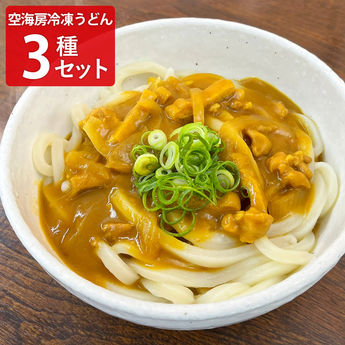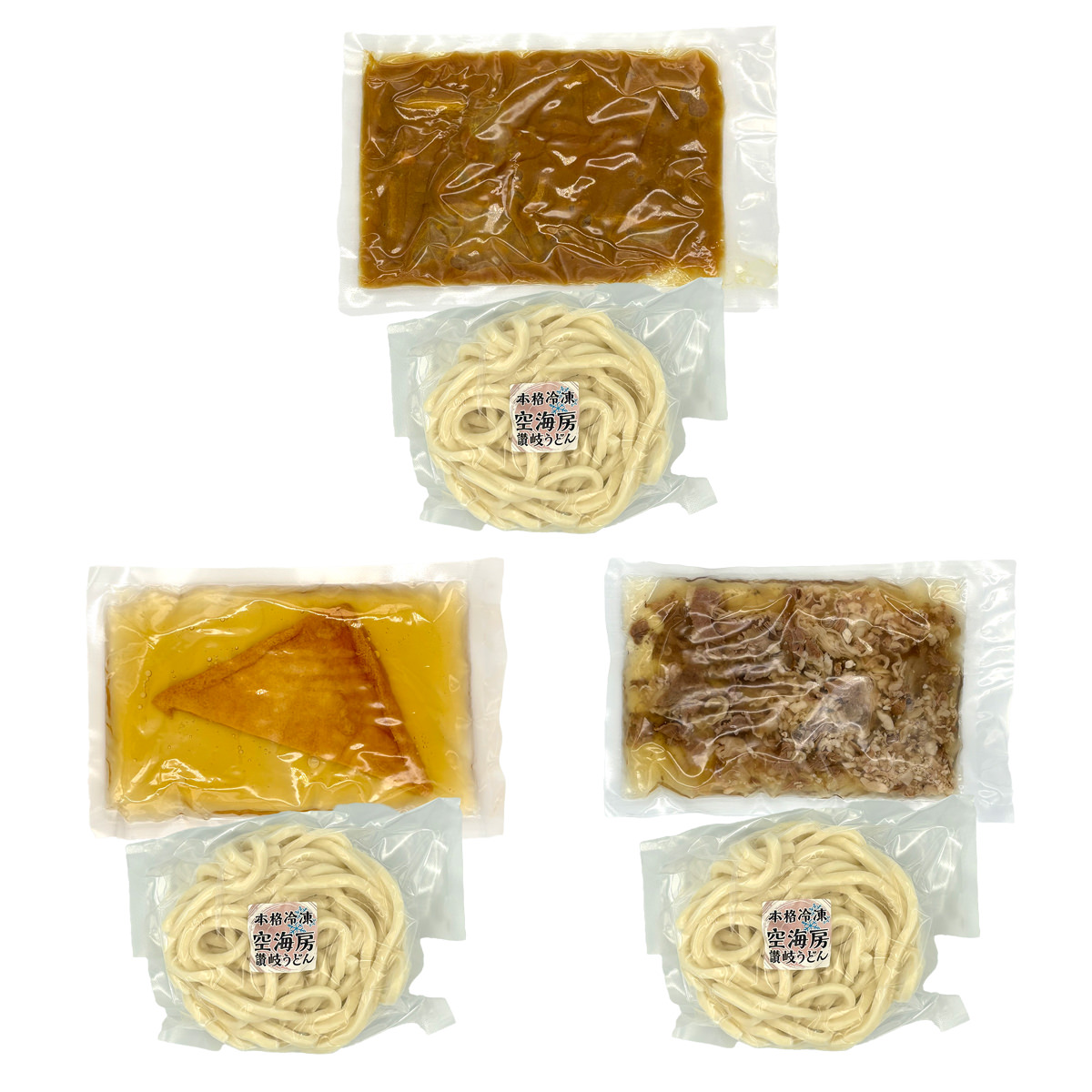「讃岐うどん 空海房 冷凍うどん 詰め合わせ 食べ比べセット」は、1日平均400人の香川県民が来店する”讃岐うどん 空海房(くうかいぼう)”で人気上位を誇る3商品の詰め合わせです。肉うどん、きつねうどん、カレーうどんをセットにしました。電子レンジで温めるだけの簡単調理で、いつでもどこでも手軽にお召し上がりいただけます。お好みで薬味を加えてお召し上がりください。<肉うどん>肉の油抜きから煮込みまで手間暇かけて作りました。煮込まれた玉ねぎが甘みを引き立てます。<きつねうどん>希少天然還元水”空海の泉”を使い、しっかりと出汁をとりました。うまみたっぷりのかけ出汁に、甘辛く煮た油揚げを乗せた逸品です。<カレーうどん>数種の香辛料とかけ出汁を混ぜ合わせて、鶏肉、玉ねぎ、油揚げをじっくり煮込みました。素材の旨みと甘みをお楽しみいただけます。{調理方法}うどんは袋のまま電子レンジ(600W)で6分ほど加熱、出汁は袋のまま器に乗せて電子レンジ(600W)で3分ほど加熱してください。うどんを器に移し、温めた出汁をかけてお召し上がりください。