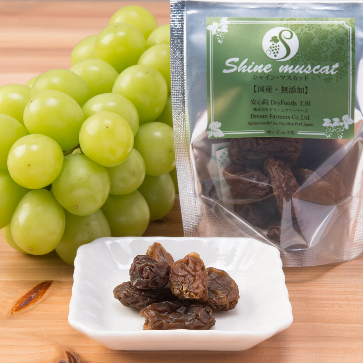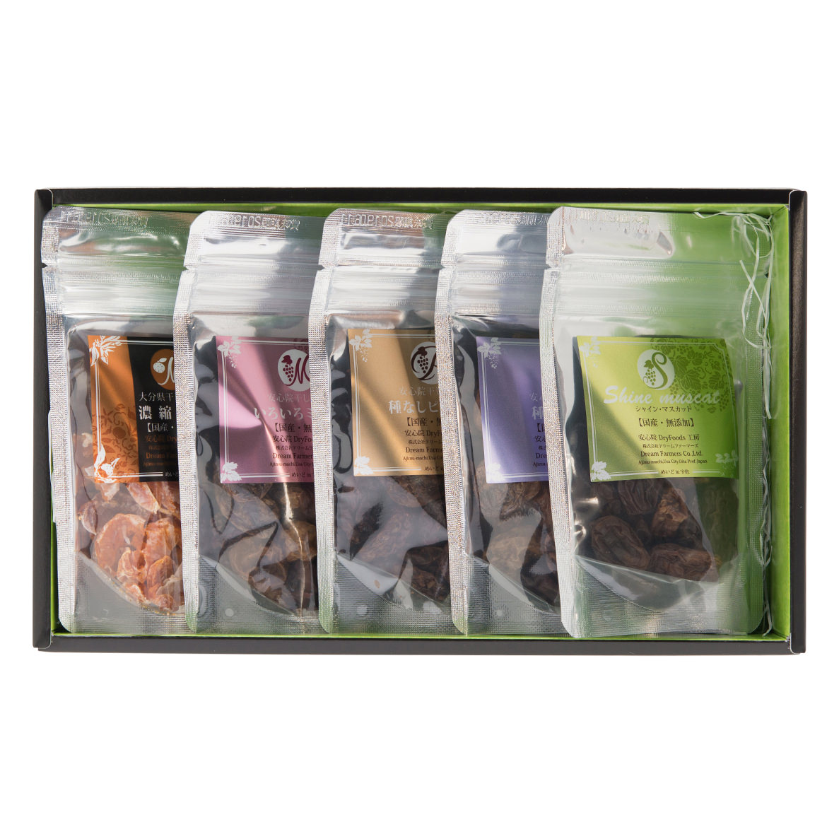 大分県宇佐市在住の農業者、ブドウ生産者が厳選した素材を完全手作業でつくり上げた「安心院干しブドウと干しミカンギフトセット」をお届けします。大分県最大のぶどう産地宇佐市にある安心院で栽培されたブドウをていねいに手作りで食品添加物や保存料を一切使用せずに製造しています。ぶどうもみかんも全て大分県産です。干しぶどうは「シャインマスカット」「ピオーネ」「青春巨峰」「いろいろミックス」の4種類です。「シャインマスカット」は高級ぶどうを贅沢に使い、天然の甘味と香味をご堪能いただける逸品です。「ピオーネ」は種無しで大粒の薫りたかい味わいです。「青春巨峰」は青春時代の甘酸っぱい思い出のような糖度と酸味のハーモニーをお楽しみいただけます。「いろいろミックス」は、安心院で収穫した数種類のぶどうをミックス、つくり手の想いもミックスし産地再生への熱い願いも込められた干しぶどうです。「干しミカン」は濃厚な完熟の温州みかんをシンプルに仕上げた素朴な味わいです。自然なフルーツの美味しさをぜひお楽しみください。