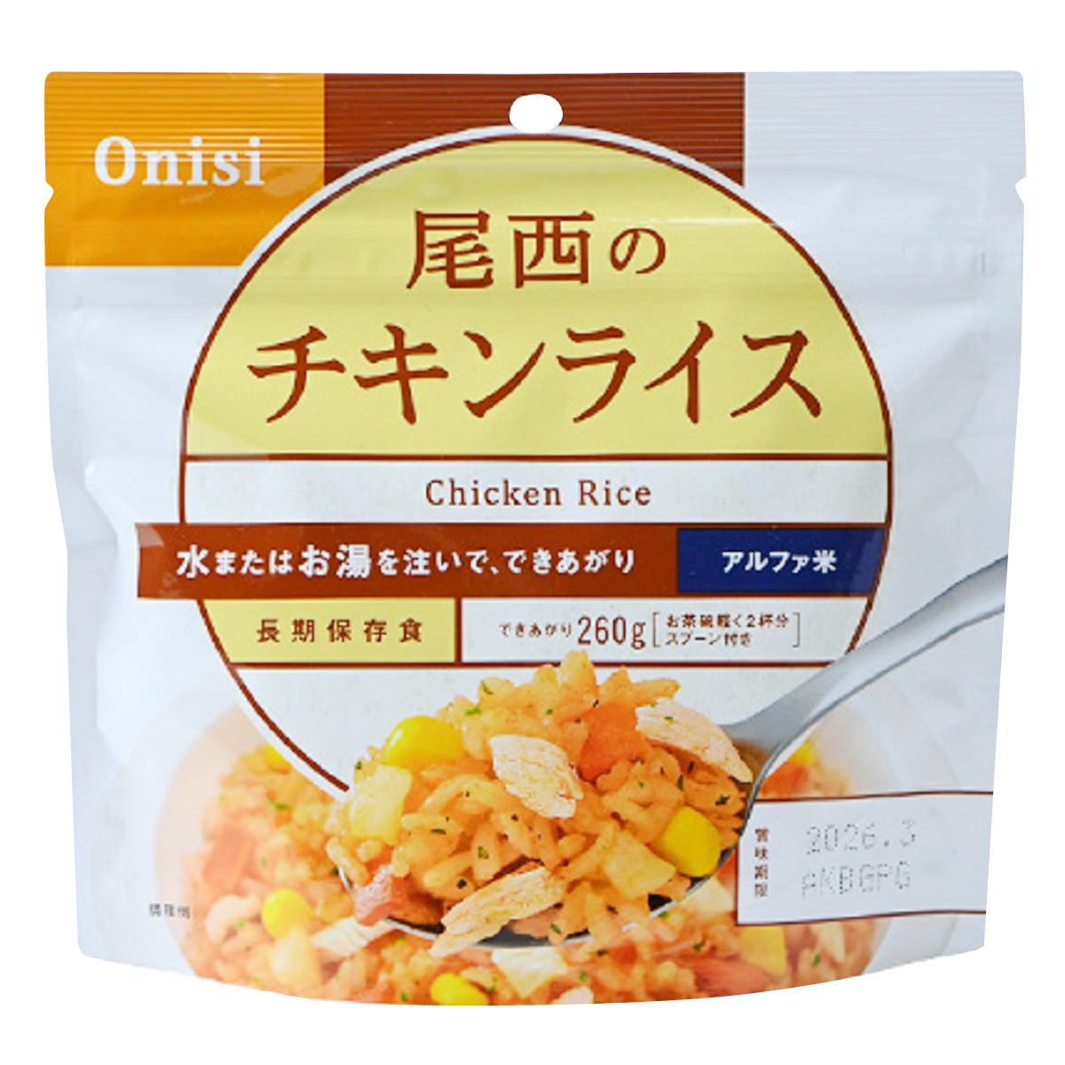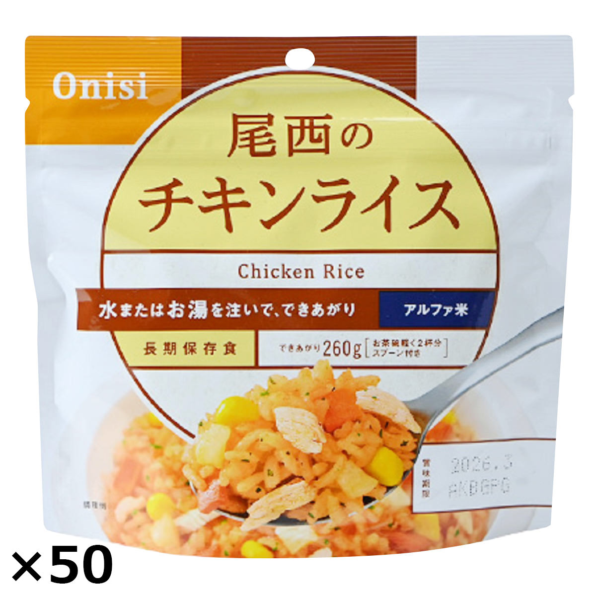 尾西食品の「尾西のチキンライス」50食セットです。尾西食品の水だけで戻せるアルファ米のチキンライスです。お湯でも水でもつくれます。トマトの酸味と香りが特徴のケチャップご飯です。コーンの甘味がアクセントになっています。でき上がりの量は、お茶碗軽く2杯分(260g)です。スプーン付きなので、袋を開けてお湯(または水)を注ぐだけで手軽にどこででもお召し上がりいただけます。食べ終わった後のごみも少なくてすみます。日本災害食認証、5年の長期保存が可能です。尾西の保存食シリーズは、もしもの時の長期保存食、非常食としての利便性だけでなく、美味しさにもこだわっています。登山やアウトドアの携行食、災害用非常食、備蓄食料など、用途に合わせた使い方でいつでもおいしく食べられる保存食品です。