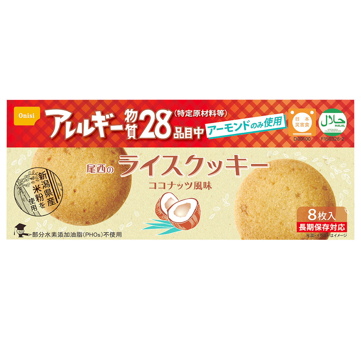 尾西食品の「尾西のライスクッキー」48箱セットです。■グルテンフリー ■ハラル 認証(ハラール 認証) ■日本災害食 認証 長期保存可能なクッキーです。一般的なクッキー材料の小麦、乳、卵は使わず、新潟県産米粉で焼き上げました。アレルギー物質(特定原材料等)27品目は使用しておりません(アーモンドを使用しています)。1959年、新潟・長岡で操業した「ガトウ専科」の素材にこだわり、地元の自然の恵みを生かした洋菓子作りで評判のパティシエがカラダに優しいライスクッキーを香ばしく焼き上げました。口どけのよいサクサク食感に仕上がっています。部分水素添加油脂(PHOs)や保存料も不使用です。コクと風味が豊かなココナッツ風味ですので、お子様のおやつとして友達と一緒に食べてもらえたらとても嬉しいです。また5年常温保存が可能ですので、ご自宅の備蓄食としてもおすすめです。どうぞご賞味ください。
