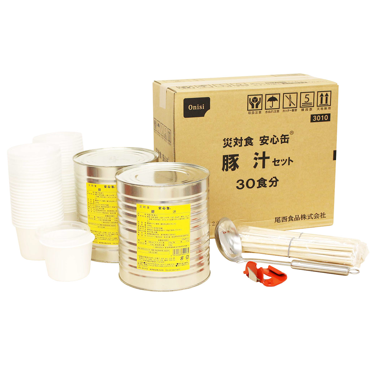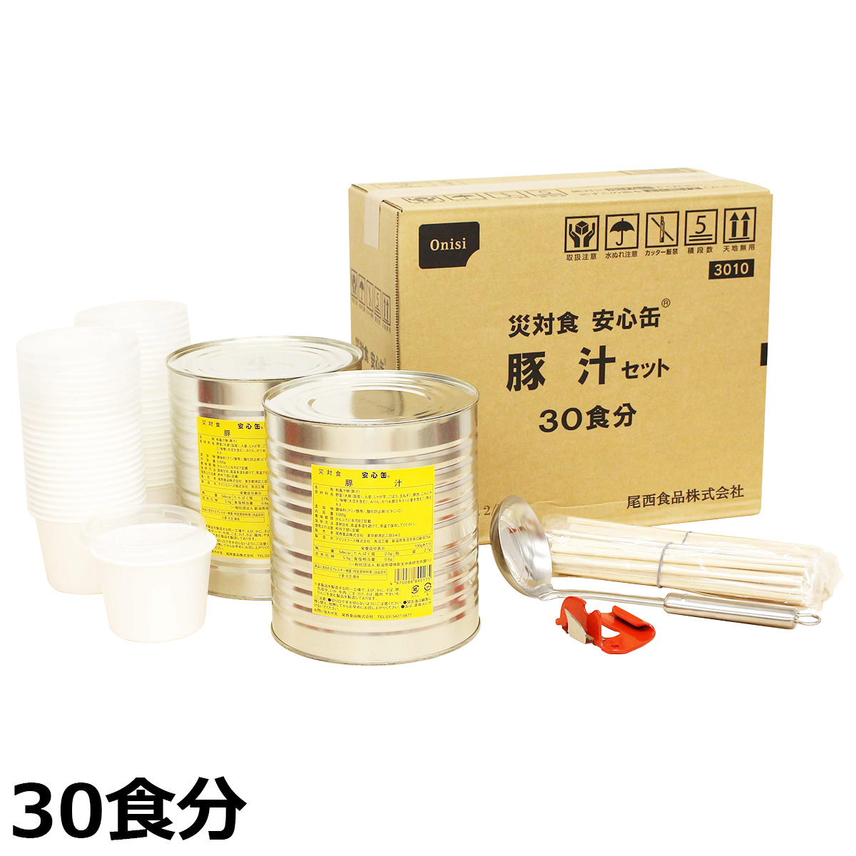 尾西食品の「安心缶 豚汁セット」30食分セットです。保存性に優れた缶詰3kg×2と備品一式(蓋付カップ・割箸×各30、缶切り、おたま、取扱説明書)を一緒にしてお届けします。豚肉と野菜をたっぷり使い、上質のお味噌で仕上げた豚汁の缶詰です。調理済みですのでフリーズドライ食品のようにお水やお湯は必要ありません。非常時には缶の中身を鍋にうつして加熱していただければ温かい豚汁をお召し上がりいただけます。町内会や自治会、企業や施設での備蓄用におすすめです。尾西の保存食シリーズは、用途に合わせた使い方でいつでもおいしく食べられる、保存食品です。