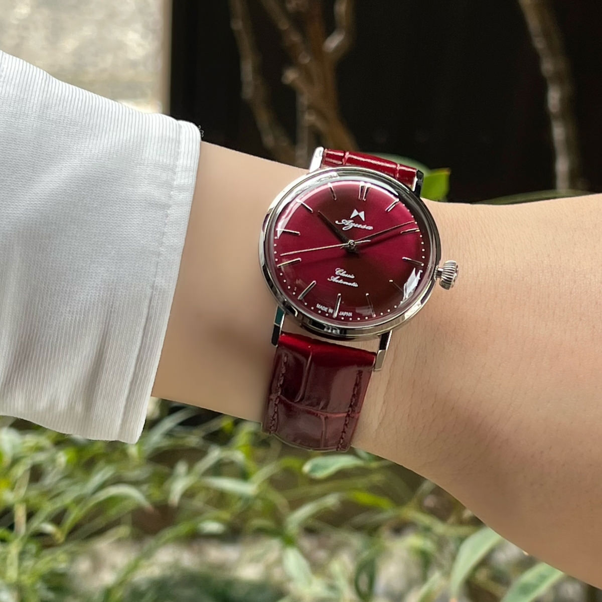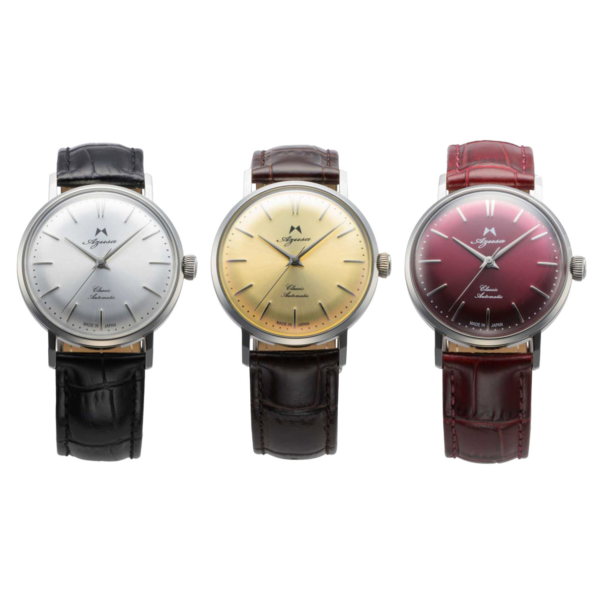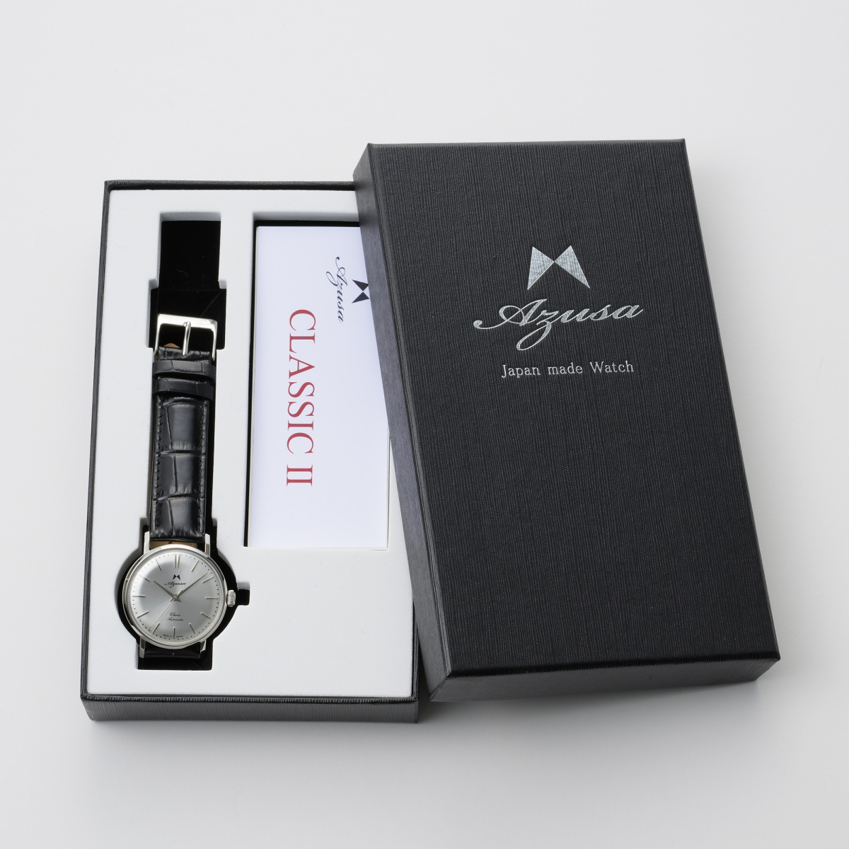 「腕時計 Azusa CLASSIC II」は、南安精工(なんあんせいこう)の職人が作り上げる自動巻機械式の日本製腕時計です。「Azusa(アズサ)」は、日本製のいいものを末永く使ってほしいという思いから、機械式にこだわり、長野県安曇野市の南安精工が企画・製造をしているオリジナルウォッチブランドです。そのブランドの最初のモデルとして2009年に誕生し、発売以来多くの皆様に愛されてきた手巻式腕時計の「Azusa CLASSIC(クラシック)」が手巻から自動巻にブラッシュアップして登場。老若男女問わずお使いいただける程よいサイズやアンティーク調のデザインなど、オリジナルモデルの良さをそのまま引き継ぎながら、使い勝手も向上させ、より一層魅力的な時計に生まれ変わりました。文字盤カラーはシルバー・ゴールド・バーガンディーの全3色の中からお選びいただけます。