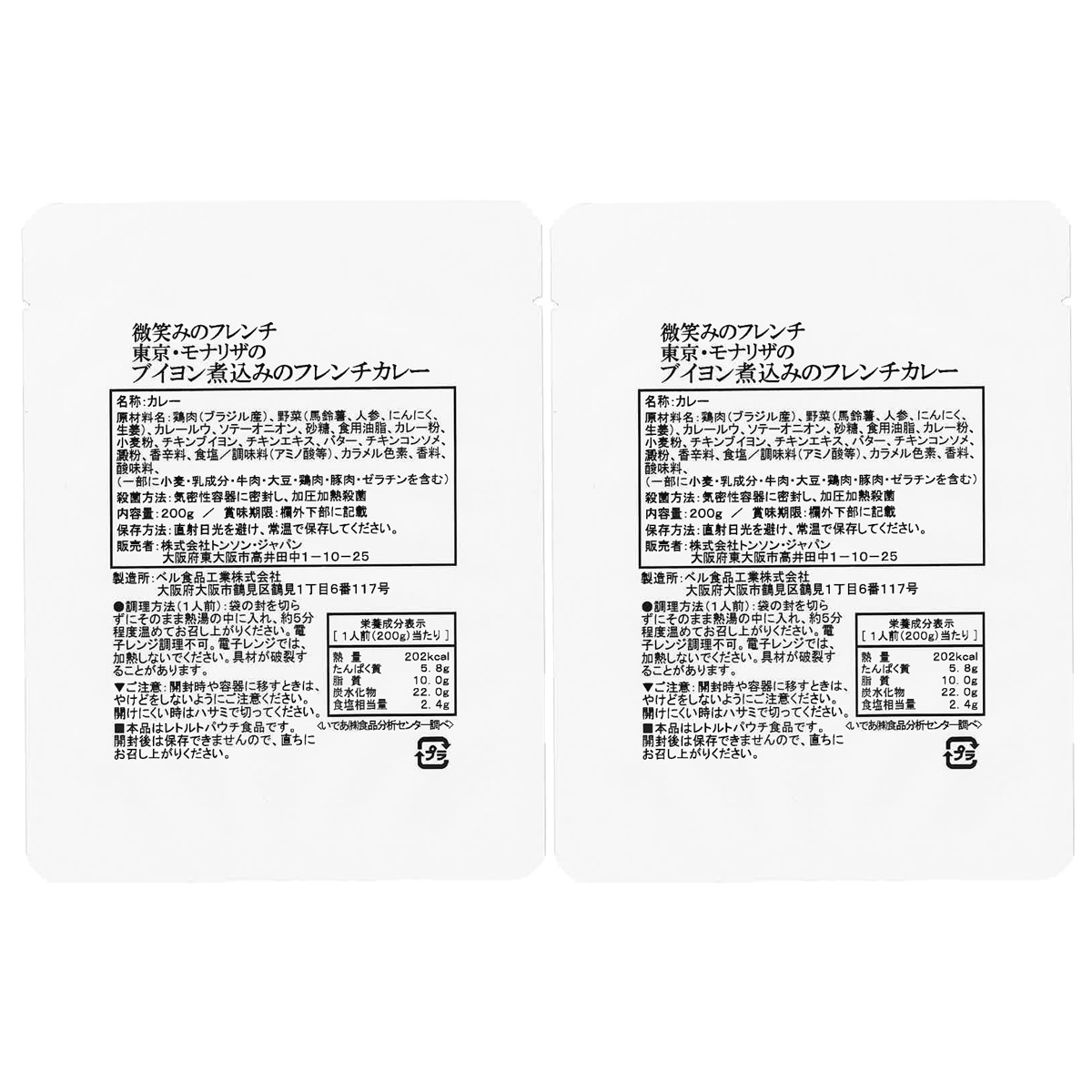 ●原材料:鶏肉(ブラジル産)、野菜(馬鈴薯、人参、にんにく、生姜)、カレールウ、ソテーオニオン、砂糖、食用油脂、カレー粉、小麦粉、チキンブイヨン、チキンエキス、バター、チキンコンソメ、澱粉、香辛料、食塩/調味料(アミノ酸等)、カラメル色素、香料、酸味料、(一部に小麦・乳成分・牛肉・大豆・鶏肉・豚肉・ゼラチンを含む)