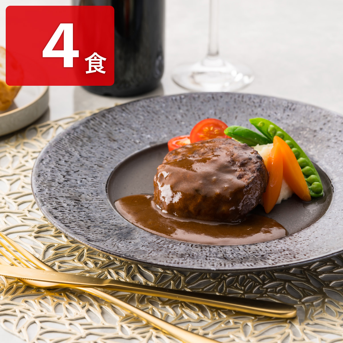 ●原材料:ハンバーグ(食肉(牛肉(アメリカ、メキシコ、その他)、豚肉)、玉ねぎ、つなぎ(卵、パン粉、牛乳、粉状植物性たん白、食物繊維(馬鈴薯由来)、でん粉)、食塩、香辛料、砂糖/調味料(アミノ酸等)、メタリン酸Na)、ソース(玉ねぎ、砂糖、デミグラスソース、小麦粉、ワイン、トマトペースト、ビーフエキス、食用大豆油、バター、食塩、ビーフコンソメ、香辛料/増粘剤(加工デンプン、増粘多糖類)、カラメル色素、調味料(アミノ酸等)、クエン酸、香料)、(一部に小麦・卵・乳成分・牛肉・大豆・鶏肉・豚肉・ゼラチンを含む)
