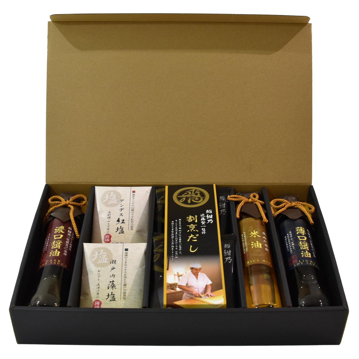 ●数量・内容:鮨 紺乃 近藤賢一監修 あご入り割烹だしパック8g×5、鮨 紺乃 近藤賢一監修 飛騨高山濃口醤油200ml×1、鮨 紺乃 近藤賢一監修 飛騨高山薄口醤油200ml×1、アンデス紅塩50g×1、瀬戸内藻塩50g×1、米油165g×1