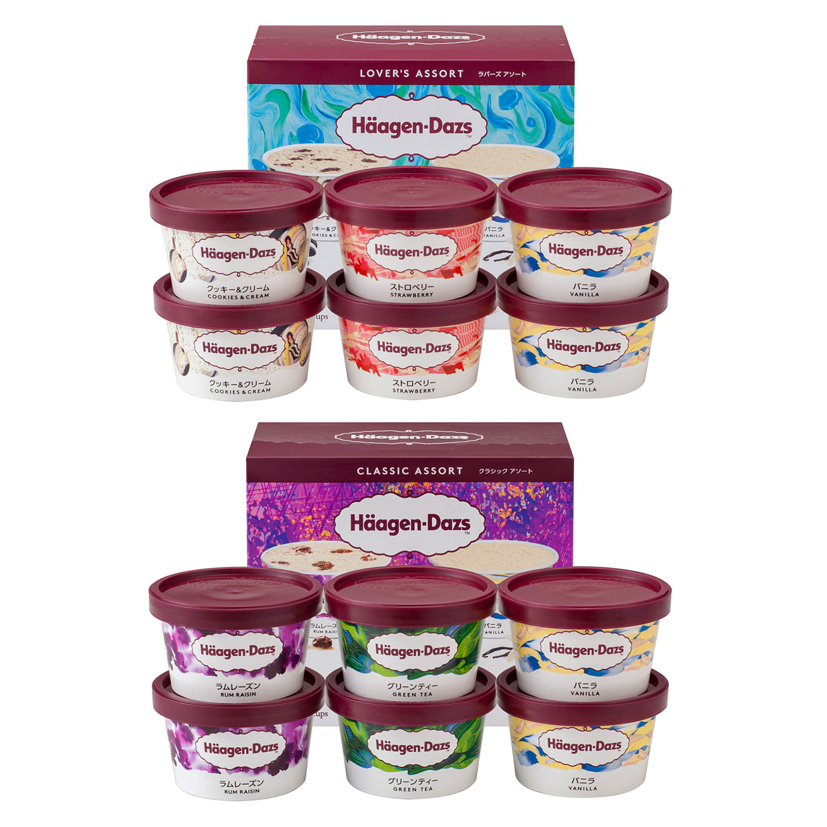 「ハーゲンダッツ アイスクリーム 食べ比べセット」は、ハーゲンダッツで人気のフレーバー3種類が入った”ラバーズアソート”と、こだわりの素材を使用した大人向けフレーバー3種類が入った”クラシックアソート”のセットです。おやつやデザート、ご褒美スイーツなどとして、お取り寄せでお楽しみください。<ラバーズアソート>・バニラ:こだわりミルクとマダガスカル産バニラを使用。口どけなめらかです。・クッキー&クリーム:香ばしいオリジナルチョコクッキーと、クリーミーなバニラアイスの組み合わせが美味。・ストロベリー:完熟いちごの果肉と果汁を贅沢に使用。<クラシックアソート>・バニラ・ラムレーズン:カリフォルニア産レーズンをラム酒でじっくり漬け込みました。(アルコール分:0.7%)・グリーンティー: 石臼挽き抹茶の濃く、深い味わいを楽しめます。ほろ苦く、すっきりとした甘さ。※「ラムレーズン」にはアルコール分0.7%が含まれます。お子様やアルコールに弱い方はご注意ください。