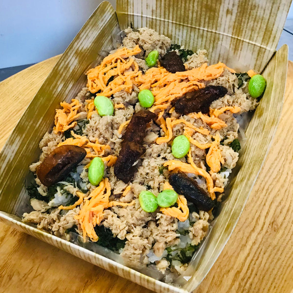 <鮪そぼろ蒸しすし>米(大分県)、鮪水煮、卵、椎茸、赤酢、醤油(小麦・大豆を含む)、米粉、砂糖、有機白醤油、こめ油、本みりん、酒、ごま油、のり、枝豆、食塩