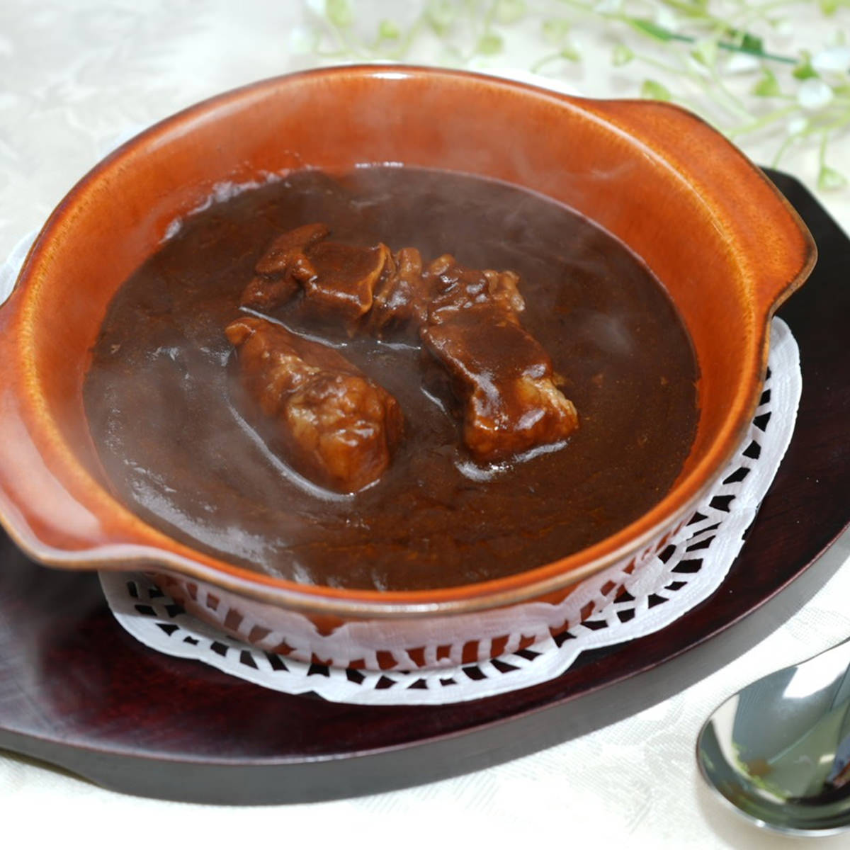 ●原材料:牛肉(カナダ産)、ソテーオニオン、人参ペースト、赤ワインソースベース(フォンドボー、砂糖加工品、ワイン濃縮物、還元澱粉分解物、その他)、デミグラスソースベース、小麦粉、植物油脂、トマトペースト、ワイン濃縮調味料、ビーフ調味エキス、ミルポワパウダー、ローストオニオンペースト、砂糖、バター、醤油、ブイヨン、香辛料、トマトケチャップ、食塩、中濃ソース/増粘剤(加工澱粉)、カラメル色素、調味料(アミノ酸等)、酸味料、香辛料抽出物、香料、(一部に小麦・乳成分・牛肉・大豆・鶏肉・豚肉・りんご・ゼラチンを含む)