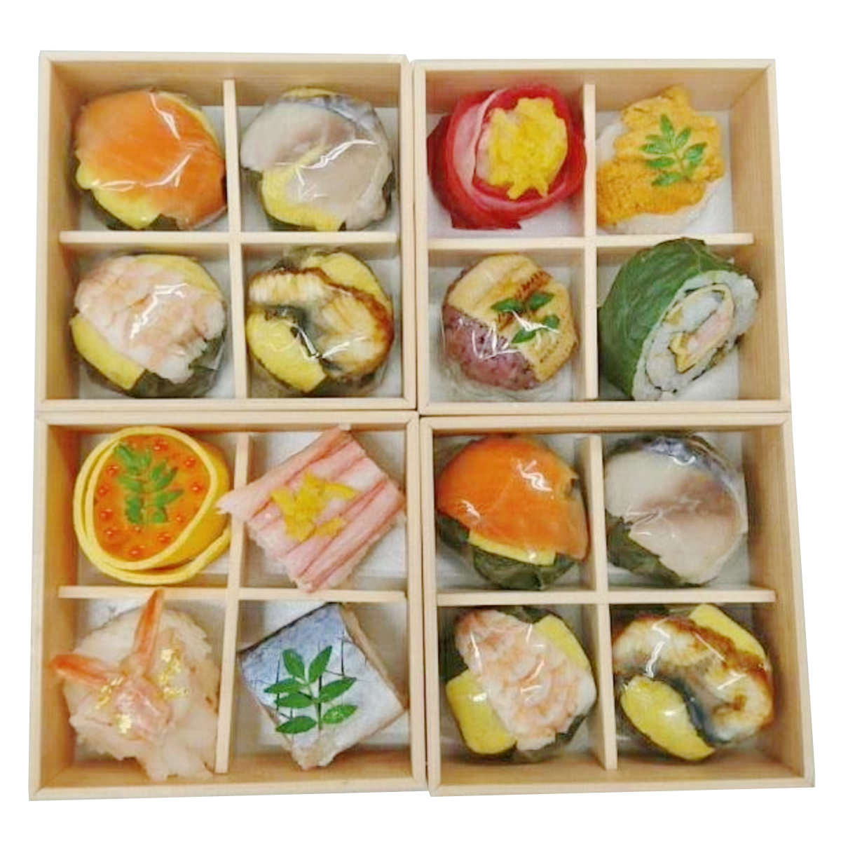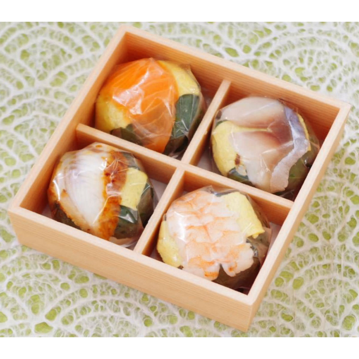 日本ギフト大賞2018ふるさとギフト最高賞の受賞商品の中から、うめもりオリジナルの手鞠わさび葉寿しと季節の人気の手鞠寿しを詰め合わせました。 一口サイズで食べやすく色彩豊かな手鞠寿司は、ふたを開けた瞬間にまるで宝石箱を開けたようにキラキラと輝きを放っています。美味しさは、全部で16種類。4個ずつ小分けになっていて、好きなものを好きなぶんだけ電子レンジで解凍。『ちょっとずついろいろ』を叶えられる逸品です。 【手鞠わさび葉寿し 鯖】 身が厚く脂の乗りが良い鯖のみを使用。肉に張りとコクがあるのが特徴です。わさびの葉のキレがある香りで、さっぱりとした鯖寿司本来のお味を楽しめます。 【手鞠わさび葉寿し 鮭】 脂がたっぷりのったサーモンを贅沢に使用しております。口に入れたとたんトロける食感と極みたつ旨味が、わさび葉の香りと相性抜群です。 【手鞠わさび葉寿し 海老】 握り寿司用の濃厚な甘さが特徴の海老を使用。甘い香りで、わさびの香りを柔らかく引き出し、大人から子供まで人気の一品です。 【手鞠わさび葉寿し 鰻】 歯ごたえがあり、身はふんわりとした鰻を使用。タレの焦げた匂いがわさびの香りと相まって、香ばしさがたまらない一品です。 【紅白華手鞠】 赤い大根を本物の椿のように仕上げた美しい華手鞠は、食卓を彩ります。 【贅沢うに手鞠】 雲丹を贅沢にたっぷりとのせた一品。雲丹のクリーミーな味わいを感じていただけます。 【古代あなら寿し】 ふわふわに焼いた穴子に、とろっとした甘いたれが、優しい口当たりを生み出しております。あっさりとした奈良漬けとの、絶妙のハーモニーをお楽しみください。 【蟹わさび巻】 本わさびの葉で巻いたうめもりオリジナルの巻き寿司です。わさびの葉の爽やかな香りが食材の旨みを引き立てます。 【いくら錦糸巻】 一口サイズのしゃりを錦糸たまごで巻き、いくらを贅沢にのせた、味も見た目も華やかな一品です。 【紅ずわいがに棒寿司】 紅ずわいがにの身をふんだんに使用し柚子をのせた色彩豊かな押寿司です。柚子のさわやかな香りが食欲をそそります。 【手鞠赤海老】 ぷりっとした赤海老に金粉をあしらった華やかで贅沢な手鞠寿しです。海老のやさしい甘みをお楽しみいただけます。 【しめ鯖棒寿司】 肉厚でジューシーな鯖を使用した、しめ鯖棒寿司です。程よい脂がおいしい一品です。