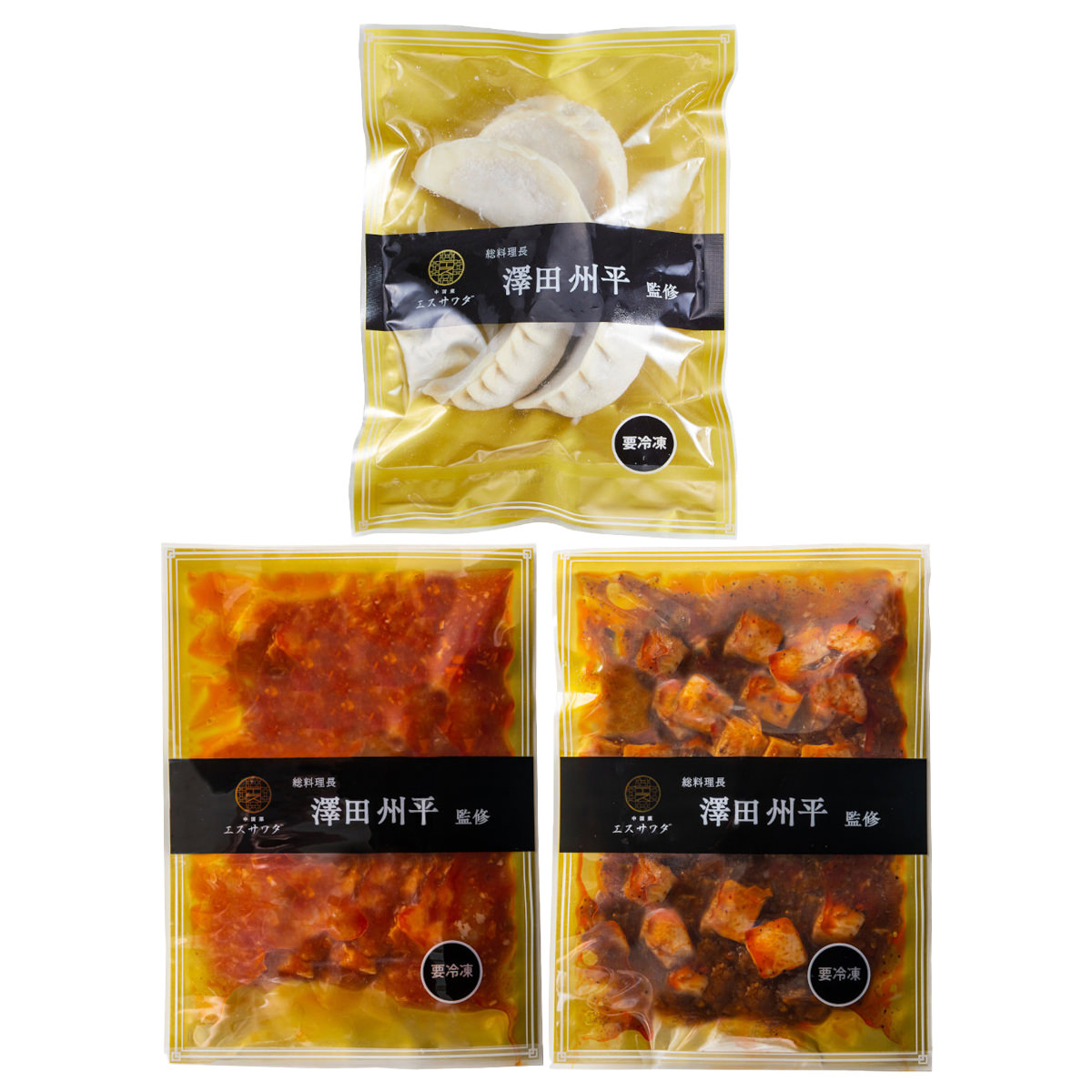 「エスサワダ 澤田州平監修 本格中華セット 詰め合わせ」は、ミシュランシェフ澤田州平氏監修による中華お惣菜コレクションです。店舗では味わえない、ここだけのオリジナル商品です。澤田シェフ厳選の素材、彩り豊かな具材の味わいを引き立てる理想的なバランスを実現しました。食卓のおかずやおつまみなどとして、本格的な中華料理をお取り寄せでお楽しみください。<大海老のチリソース>大ぶりで食べ応えのある海老を使用。海老のしっかりとしたプリプリ食感、トマトベースの酸味のバランスが良い風味豊かなチリソースを楽しめます。<本格四川風麻婆豆腐>本格的なピーシェンや花椒が香る、澤田流の麻婆豆腐。<あふれる肉汁餃子>良質な豚肉を使用し、旨みたっぷりの肉汁をギュッと閉じ込めました。 もちもちの皮は、焼くと表面はカリッと仕上がります。{調理方法}<エビチリ・麻婆豆腐>沸騰したお湯で、冷凍の状態から約8分湯煎してください。<餃子>冷凍のままフライパンで約6分蒸し焼きにします。水分が飛んだら油を回しかけ、焼き色を付けてください。