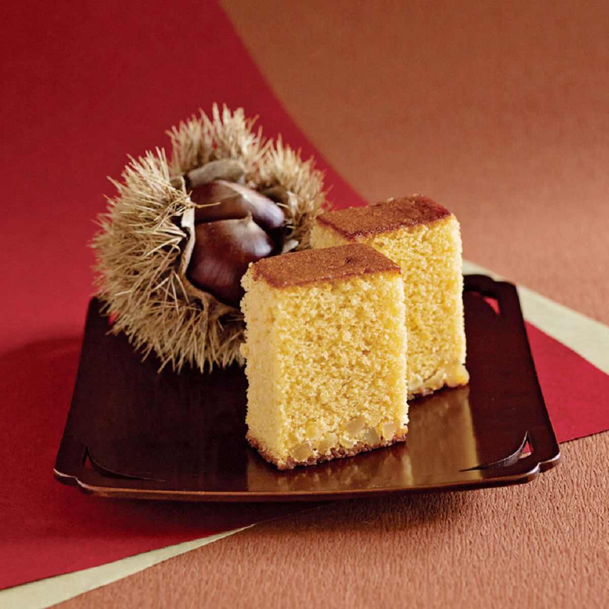 ●原材料:鶏卵(国産)、砂糖、小麦粉、水飴、栗甘露煮、マロンペースト、カラメルソース/香料、トレハロース、クチナシ色素、(一部に卵、小麦を含む)