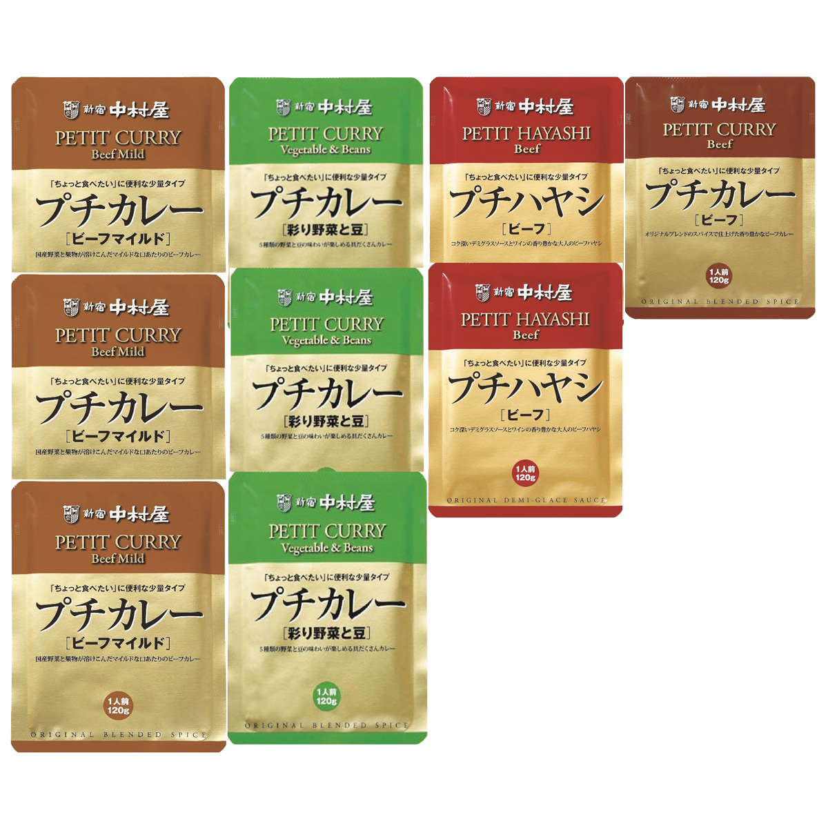 ●数量・内容:プチカレービーフマイルド×3、プチカレー彩り野菜と豆×3、プチハヤシビーフ×2、プチカレービーフ×1 各120g