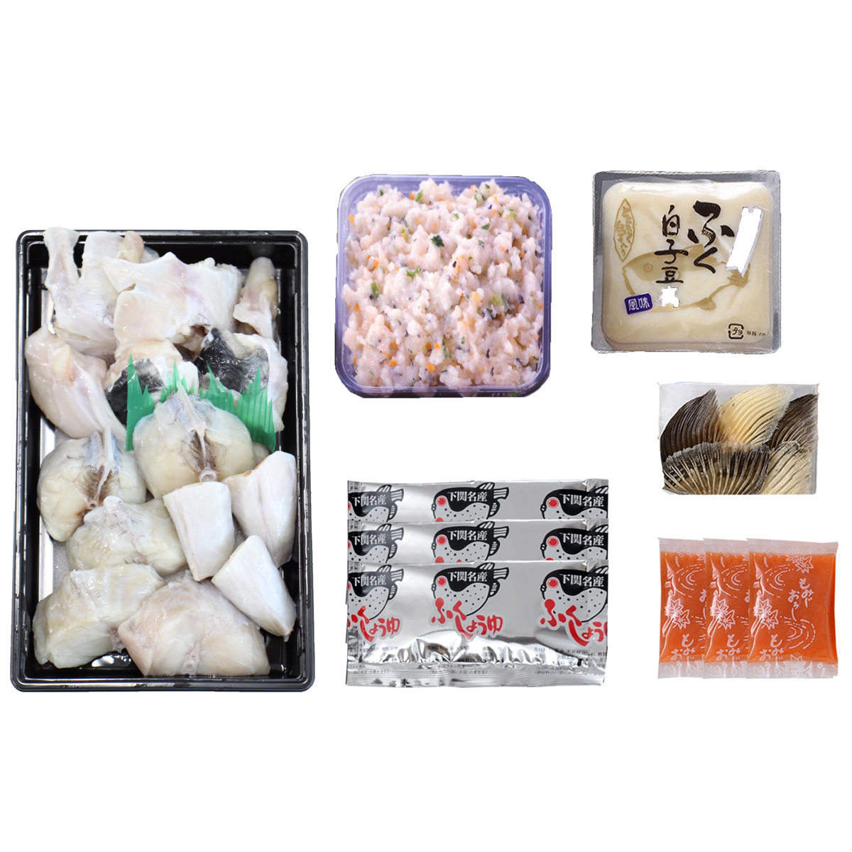 ●原材料:ト【ちり】トラフグ(長崎、熊本県産:養殖)、【ふぐ白子豆腐】豆乳、いか白子、乳等を主要原料とする食品、合成清酒、トラフグ白子、くず粉、風味調味料、食塩/トレハロース、増粘剤(加工でん粉、グルコマンナン)、調味料(アミノ酸等)、香料、酸味料、(一部に乳成分・いか・大豆を含む)、【ふぐつみれ】魚肉(スケソウダラ、イトヨリダイ)、トラフグ皮、馬鈴薯澱粉、小麦澱粉、食塩、ねぎ、人参、唐辛子/保存料(ソルビン酸、しらこ蛋白)、調味料(アミノ酸等)、甘味料(甘草、ステビア)、(一部に小麦・さけ・大豆を含む)、【ふく醤油】醤油、米発酵調味料、糖類(砂糖、水飴)、かつお節エキス、橙果汁、橙油/酸味料、調味料(アミノ酸等)、アルコール、カラメル色素、(一部に小麦・大豆を含む)、【もみじおろし】大根、澱粉、唐辛子、こんにゃく粉、梅酢