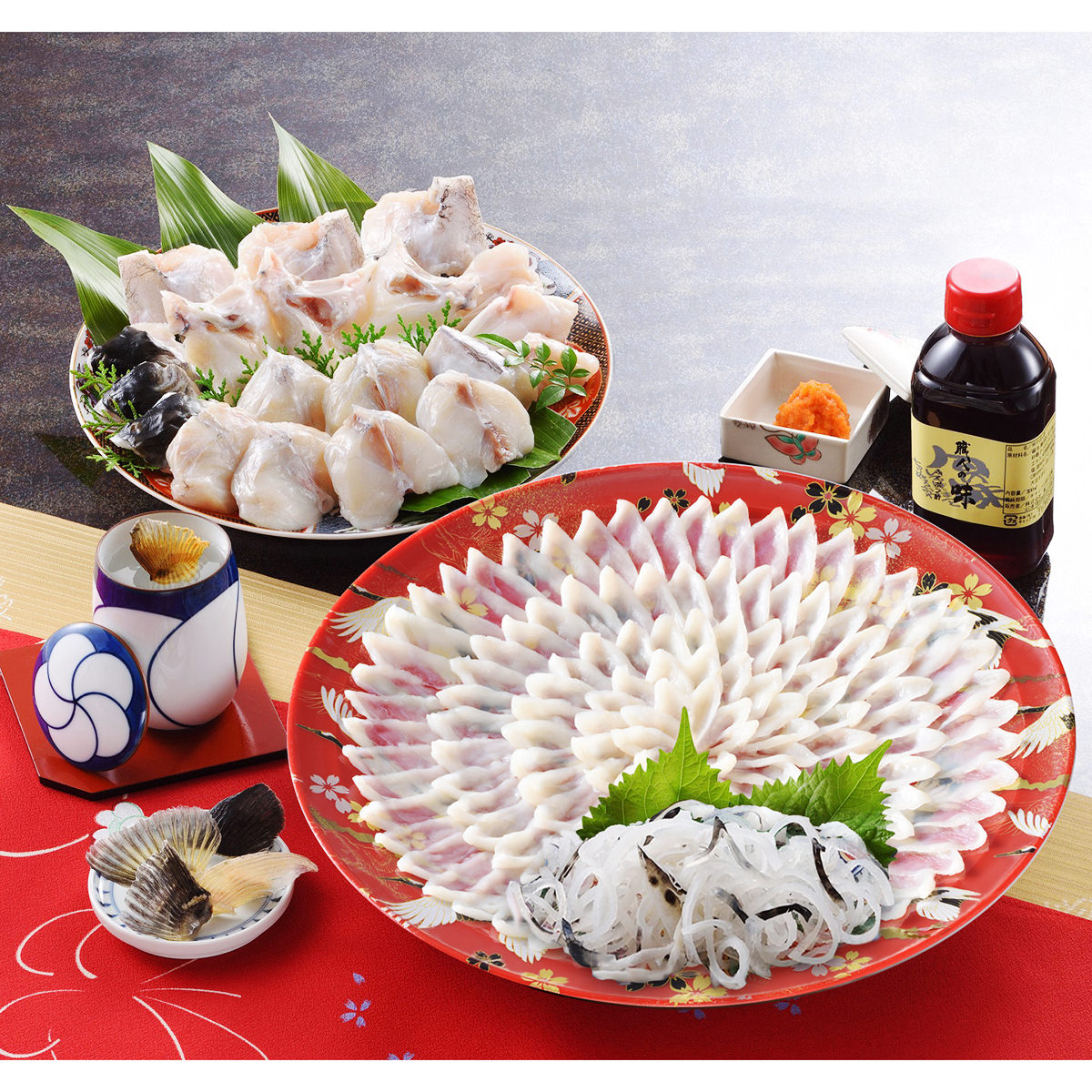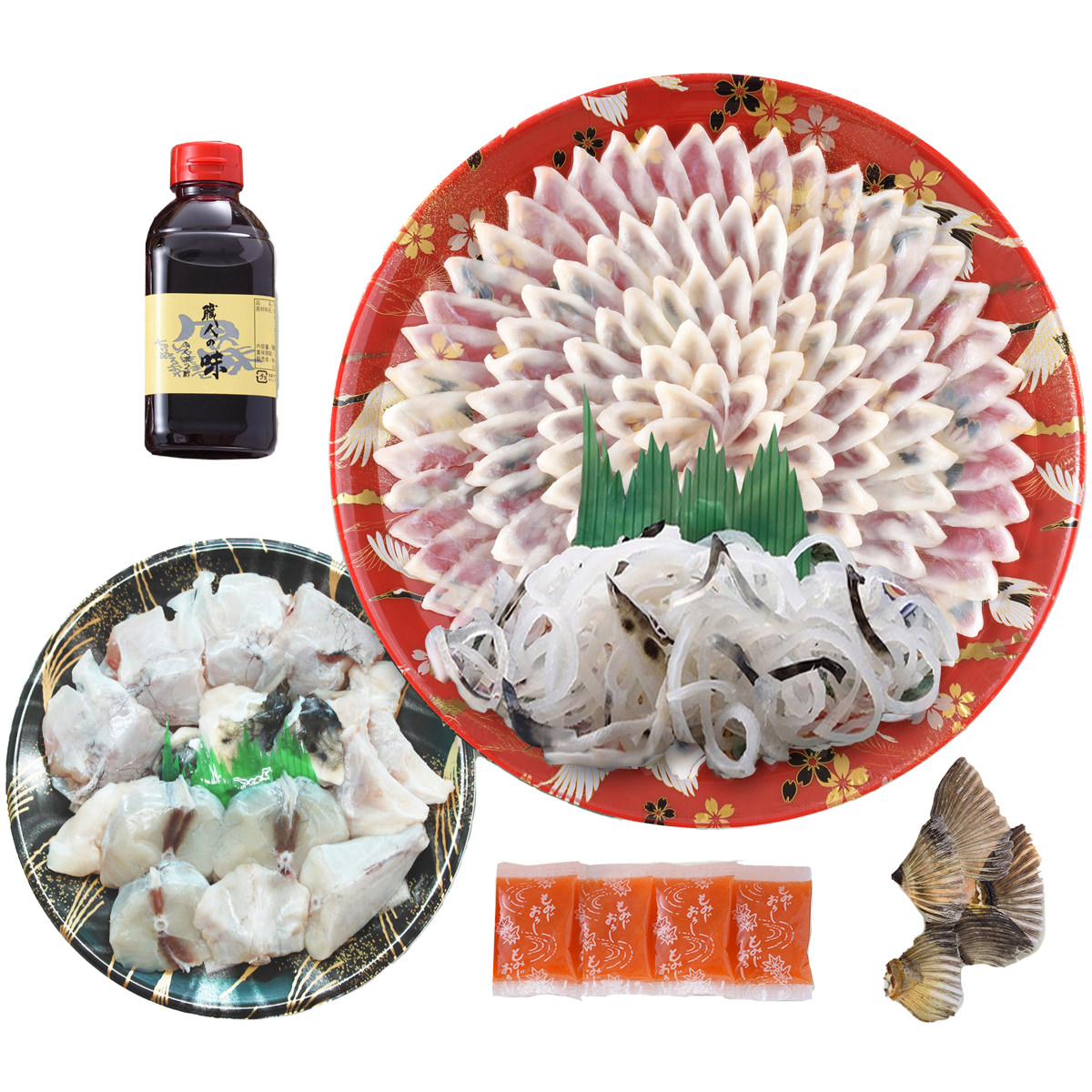 ●原材料:【ちり】トラフグ(長崎、熊本県産:養殖)、【ふくポン酢】醤油、醸造酢、ゆず果汁、砂糖、かつおエキス、昆布エキス、米発酵調味料、食塩/調味料(アミノ酸等)、(一部に小麦・大豆を含む)、【刺身】トラフグ(長崎、熊本県産:養殖)、【もみじおろし】大根、澱粉、唐辛子、こんにゃく粉、梅酢、【皮】トラフグ(長崎、熊本県産:養殖)、【ヒレ】トラフグ(長崎、熊本県産:養殖)