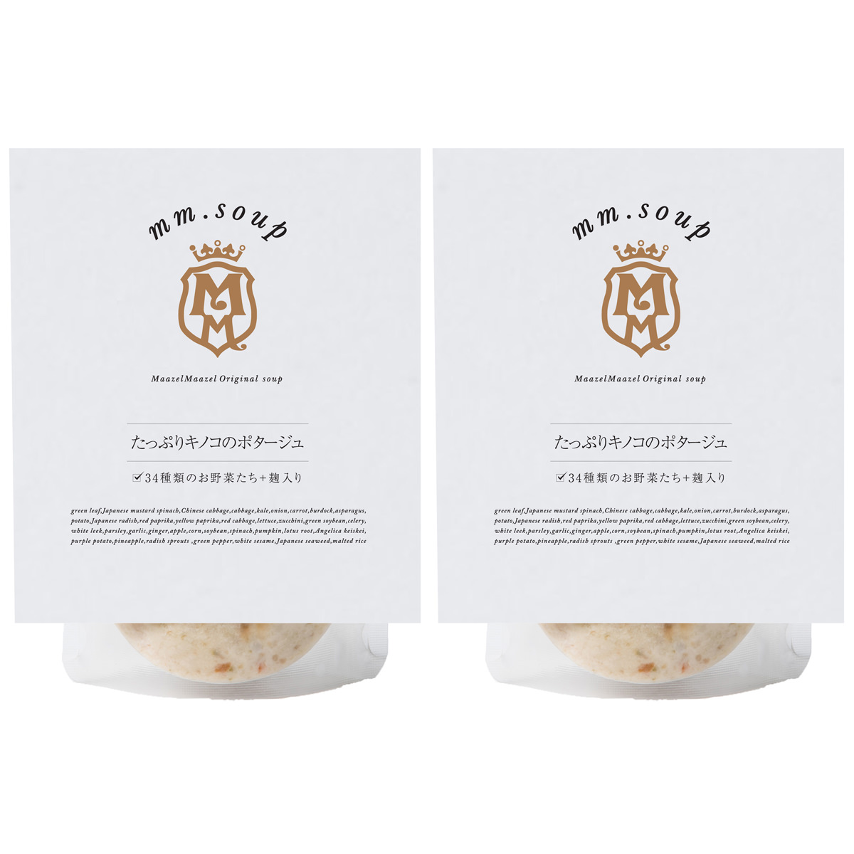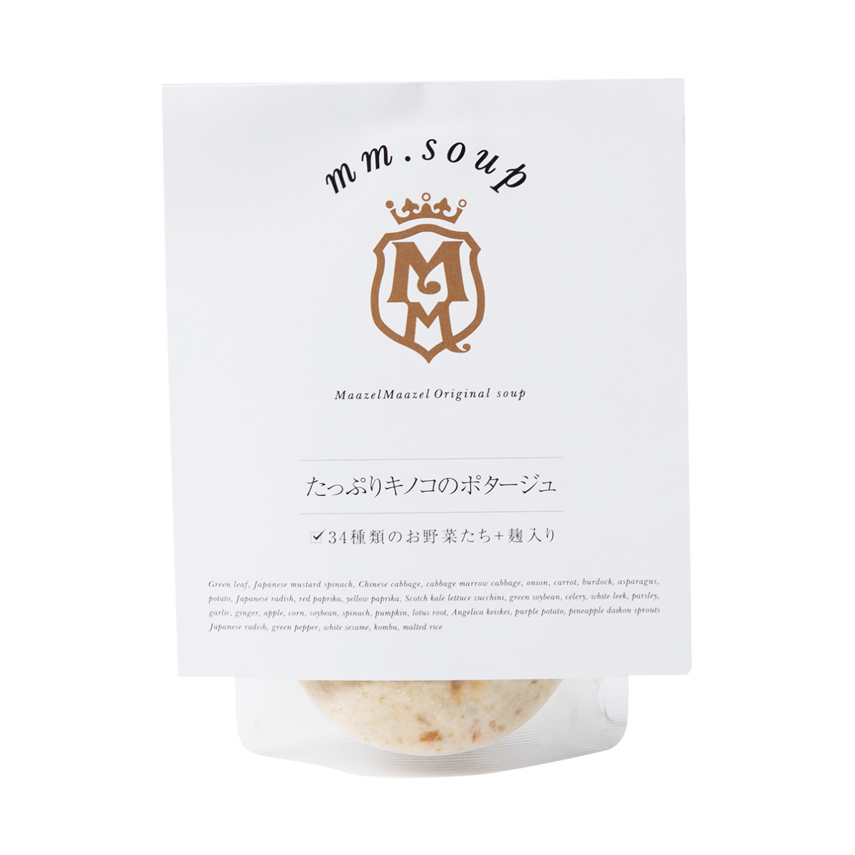Maazel Maazelオリジナルの食べるスープスムージー。「たっぷりキノコのポタージュ」は、4種類のキノコ(シイタケ・たもぎ茸・マッシュルーム・ヒラタケ)をたっぷり使用し、キノコの風味・旨味と食感をお楽しみいただけます。