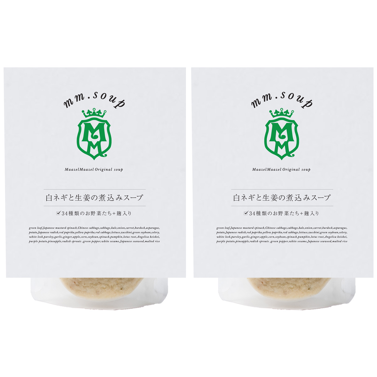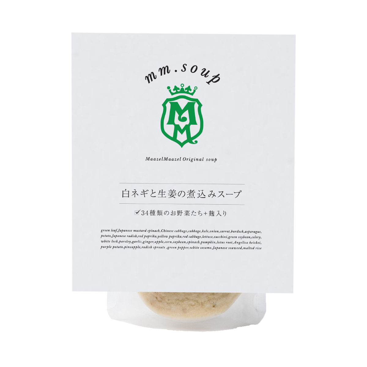 Maazel Maazelオリジナルの食べるスープスムージー。「白ネギと生姜の煮込みスープ」は、ネギと共に身体を温める働きのあるショウガを混ぜて煮込みスープにしております。
