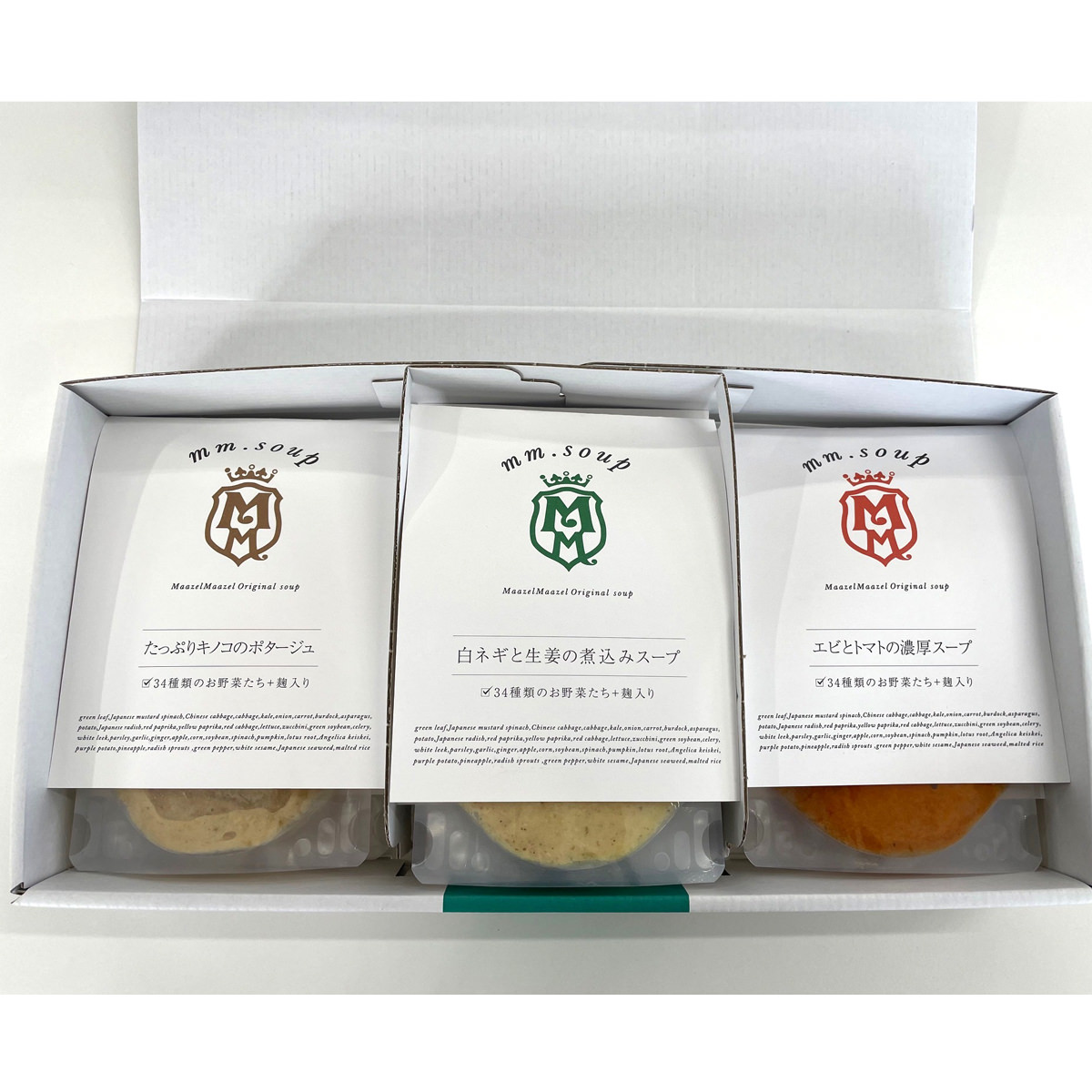 「34種のやさい畑スープ」は、野菜と米こうじで丁寧につくったスープスムージーです。常温保存できるパウチ食品で、そのままでも美味しくお召し上がりいただけますが、お好みで温めたり冷たく冷やしても。忙しい時や食欲のない時でも手軽に、Maazel Maazel(マーゼルマーゼル)オリジナルの食べるスープスムージーをどうぞご賞味ください。【とうもろこしの贅沢ポタージュ】粗く刻んだとうもろこしをたっぷり。【エビとトマトの濃厚スープ】濃厚なトマトとエビ旨味。【たっぷりキノコのポタージュ】4種類のキノコをたっぷり使った香りと味わいが贅沢なスープ。【アスパラガスと玉葱のポタージュ】下関の契約農家から仕入れた新鮮なアスパラガスを使用。【とろーり濃厚かぼちゃのスープ】カット方法にこだわった贅沢な食感。【白ネギと生姜の煮込みスープ】体を温める和食にも合うスープ。