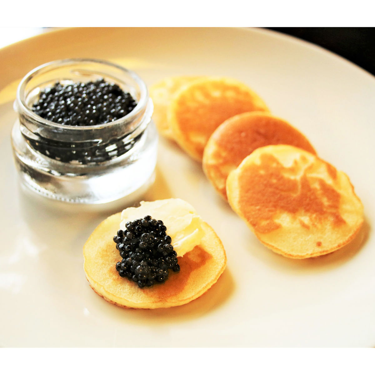 「つくばスタージョンキャビア」です。筑波山系の伏流水で育てたチョウザメから獲れる卵を、食味の良い低塩で作り上げました。まろやかな味わいのキャビアをお楽しみ下さい。