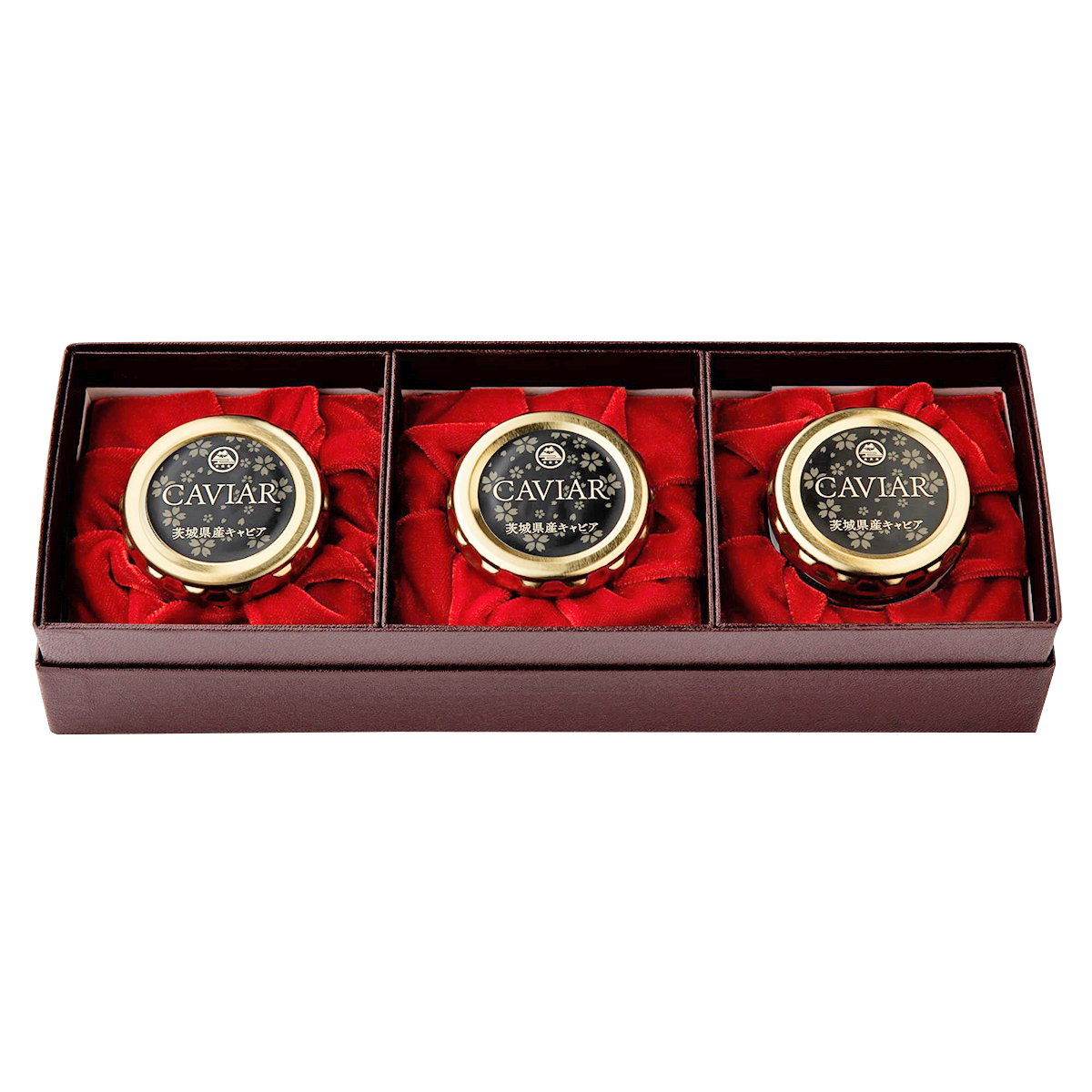 「つくばスタージョンキャビア」3個セットです。筑波山系の伏流水で育てたチョウザメから獲れる卵を、食味の良い低塩で作り上げました。まろやかな味わいのキャビアをお楽しみ下さい。