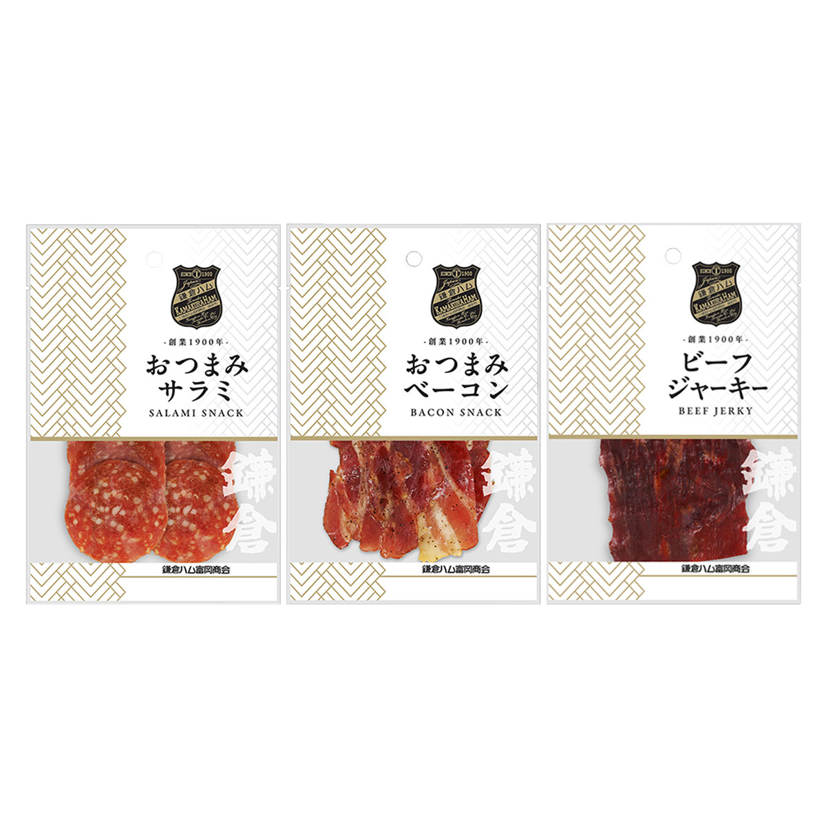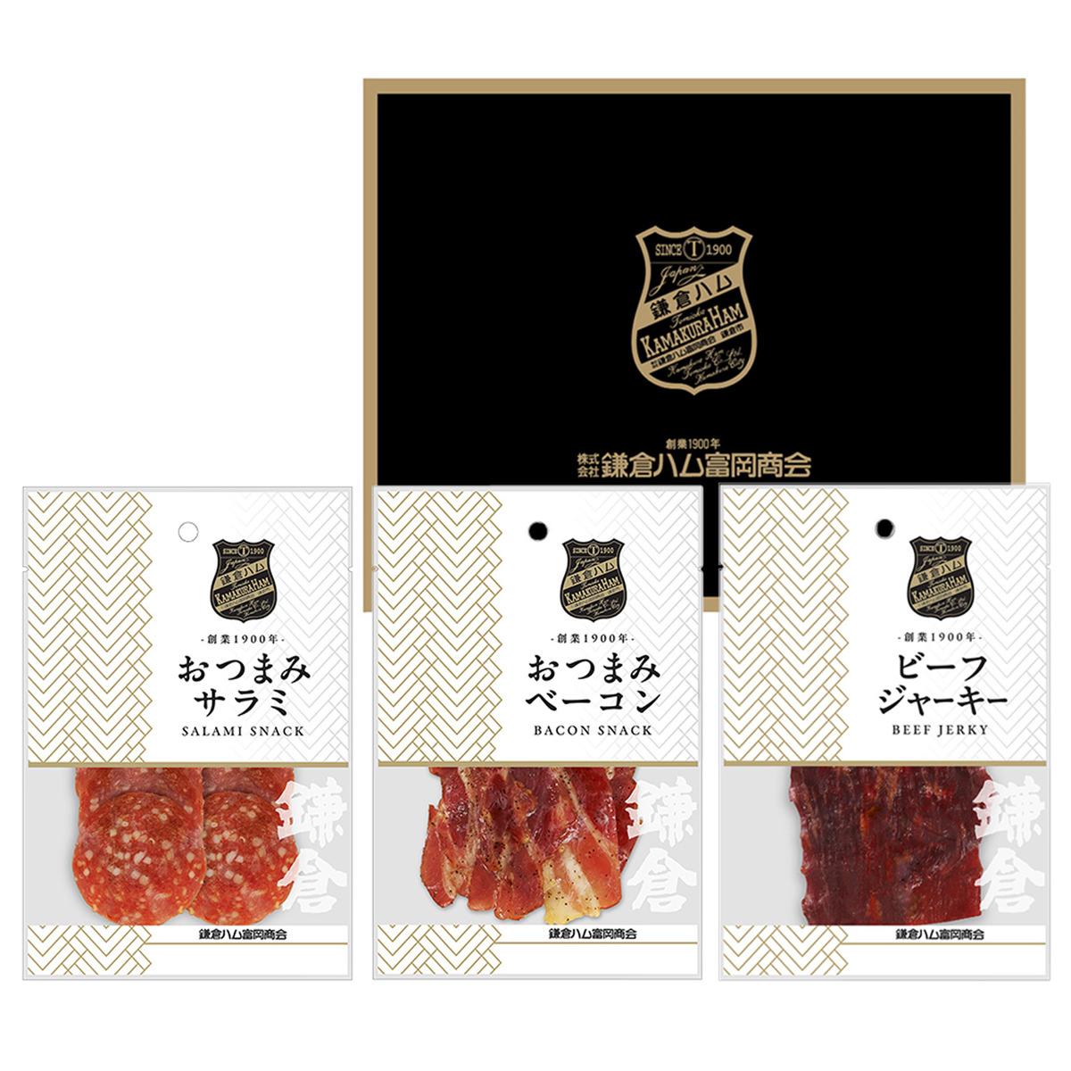 贈り物にも、ご自宅でのご利用にもぴったりの「グルメレター 鎌倉ハム 富岡商会 おつまみ3点セット」です。ポストに入る、ご不在時にもお届け可能なギフトセットです。<ビーフジャーキー>牛もも肉を、醤油ベースのタレに漬け込み仕上げた、コクのあるビーフジャーキーです。噛むほどに肉の味わいを感じます。<鎌倉おつまみベーコン>豚ばら肉の脂身の甘さに粗挽き黒こしょうとスモークの香りが調和した商品です。<鎌倉おつまみサラミ>豚肉と牛肉を使用し、乾燥して仕上げたドライソーセージです。