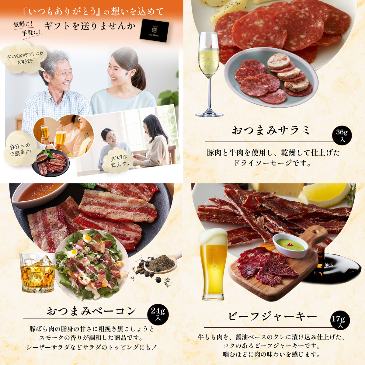 ●数量・内容:ビーフジャーキー17g、おつまみベーコン24g、おつまみサラミ36g