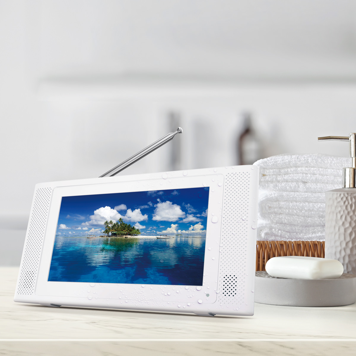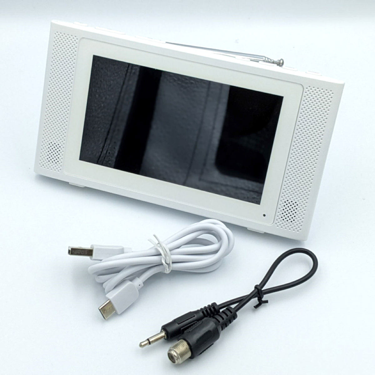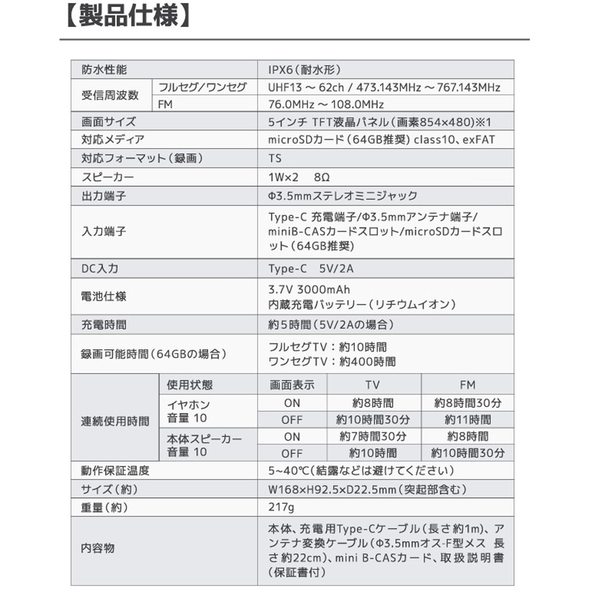 液晶サイズ5インチの持ち運びに適しているポータブルテレビながら、フルセグ放送(地デジ放送)とワンセグ放送両方の視聴に加え、視聴中の番組をボタン操作一つで録画できる機能を搭載しています。防水機能(IPX6)を備えているため、キッチンやお風呂など日常的な使用はもちろん、災害時には確かな情報を入手できる情報源として手軽に持ち運べます。3,000mAhのリチウムイオン電池を搭載のため、満充電の状態から、音量設定“10”にてテレビを視聴した場合、約7.5時間の長時間連続視聴が可能です。付属の変換ケーブル(Φ3.5mmオス-F型メス)を使用することで、ご自宅の液晶テレビ同様、アンテナ線を直接接続でき、安定したフルセグ放送の受信が可能となります。メーカー保証:お買上げ日から1年間(消耗品は除く)