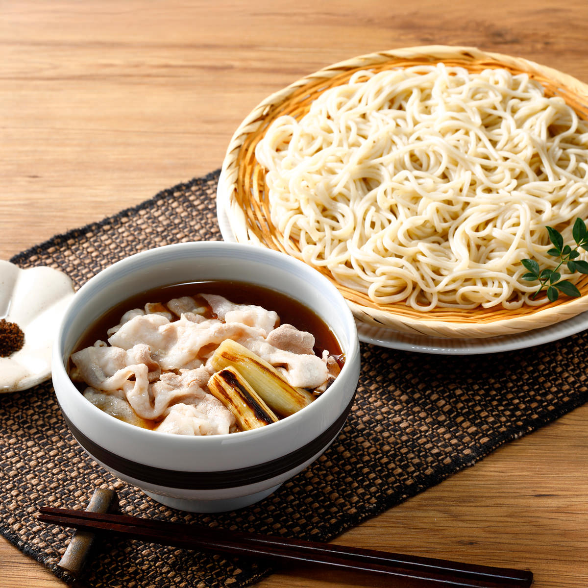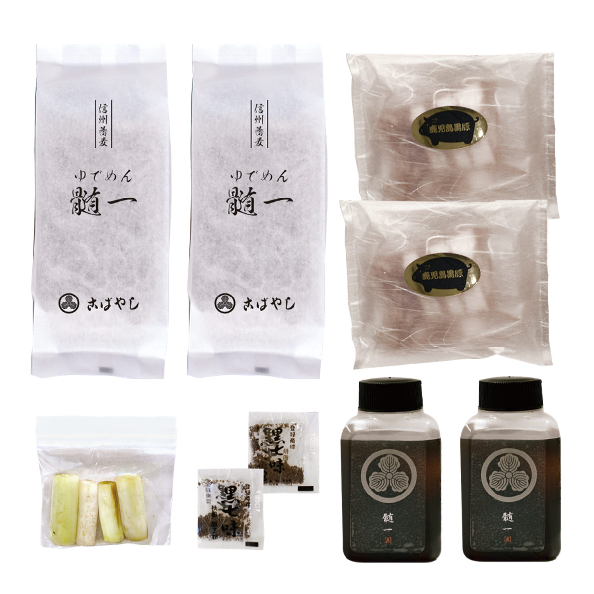 ●数量・内容:信州蕎麦200g×2、伝承のつゆ180ml×2、鹿児島県産黒豚50g×2、焼葱(4本入)×1、祇園原了郭黒七味0.2g×2