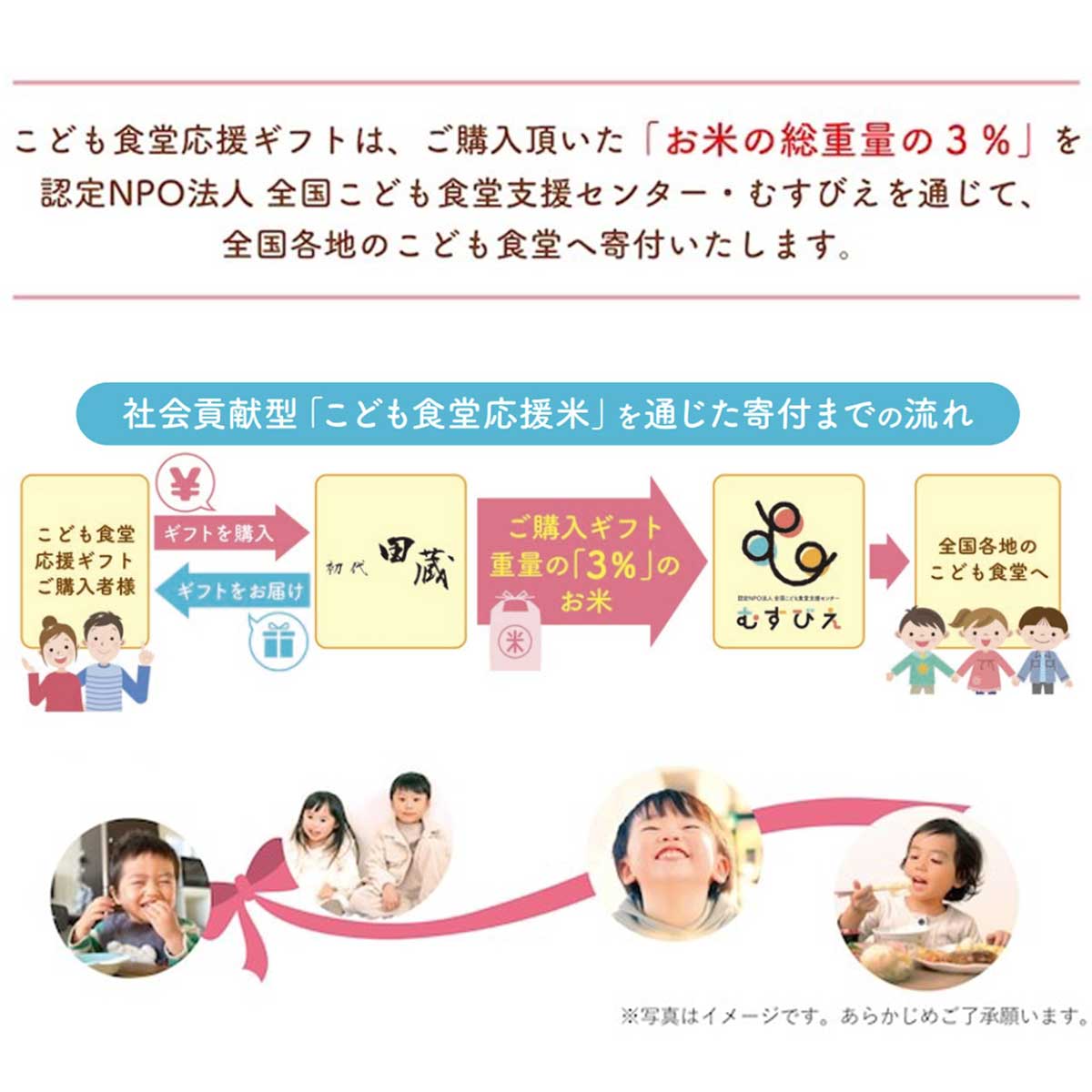 「こども食堂応援ギフト ブランド銘柄 厳選食べくらべお米ギフトセット」は、ご購入頂いたお米の総重量の3%を認定NPO法人全国こども食堂支援センター・むすびえを通じて、全国各地のこども食堂へ寄付いたします。ブランド米の食べくらべセットを高級感あふれる木箱でご用意しました。新潟県産こしひかり・新潟県産こしいぶき・秋田県産あきたこまち・岩手県産ひとめぼれ、それぞれの地方のうまみを堪能できるギフトセットです。精米したてのお米を真空パックでお届けします。真空にすることで美味しさと鮮度を保ったまま保存が出来ます。ぜひ炊き立てを味わってみてください。