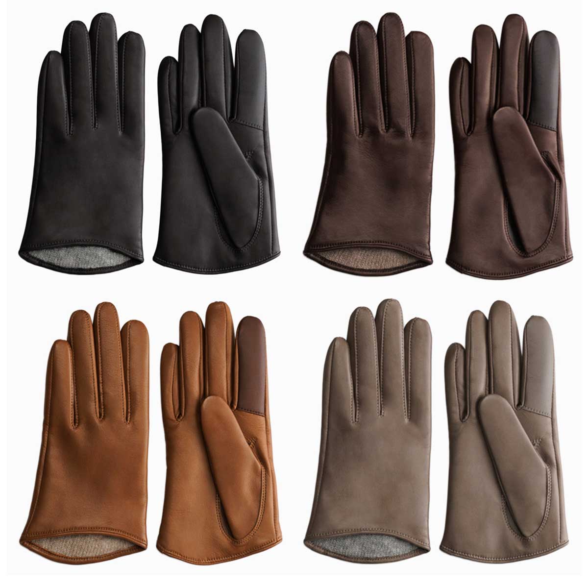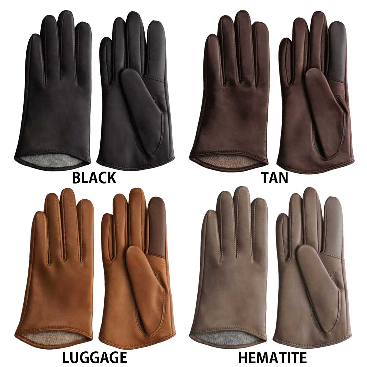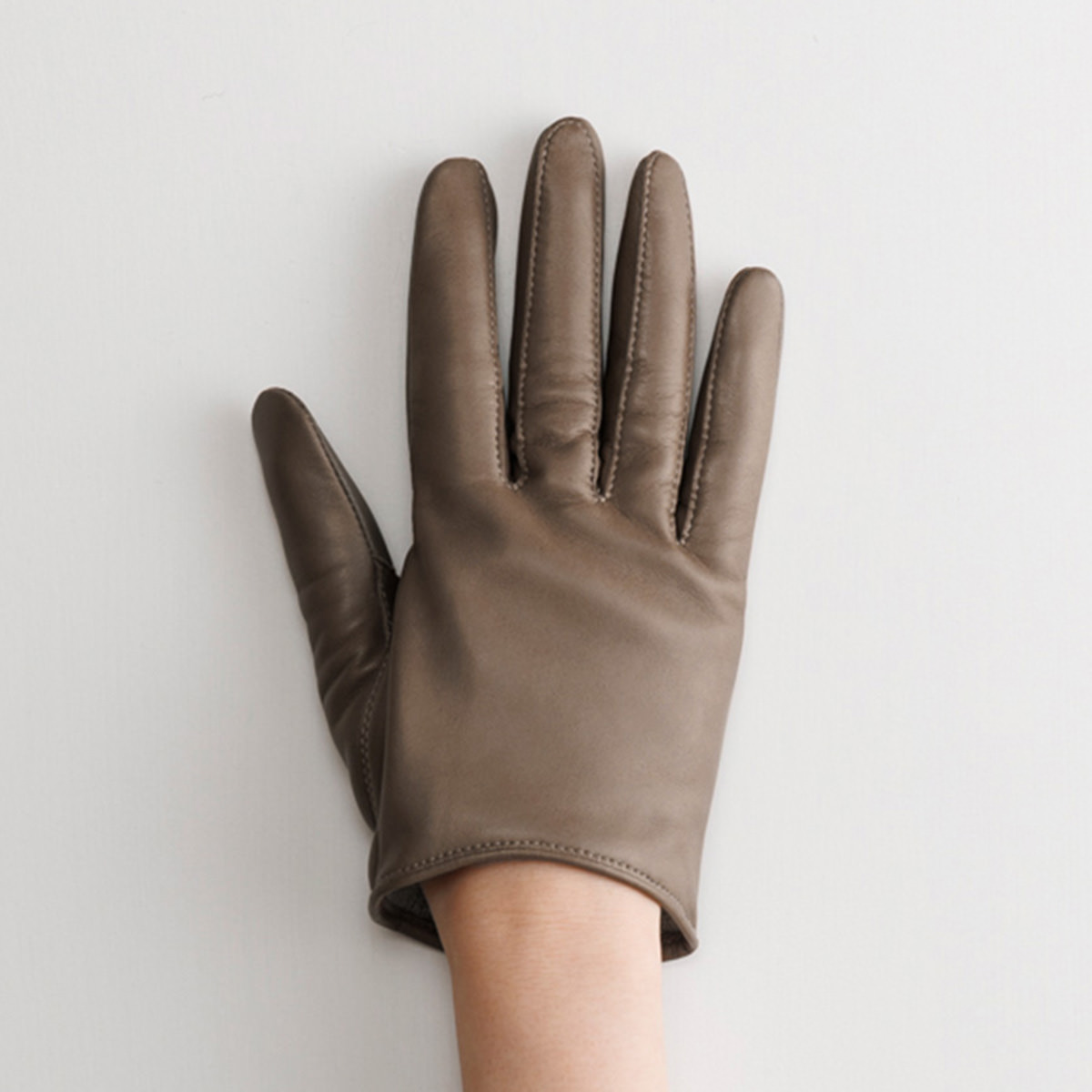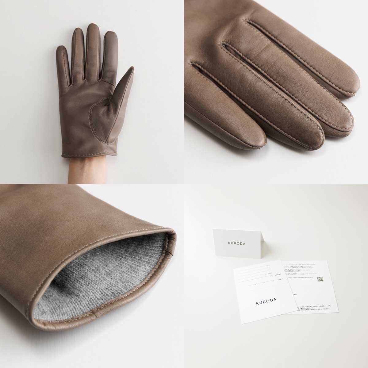 「KURODA 女性用 革手袋 スマホ対応 イタリアンシープ」は、イタリア・ポルトラーノ社から直輸入したシープレザーを使用したグローブです。しっとりと柔らかく、使い込むほど手に馴染む上質な革が特徴です。指先を美しく見せる繊細な技術が施されており、見た目にも洗練された印象に。手首までのショート丈は、袖口に干渉しにくく、コートやニットとも相性が良いです。腕時計やアウターの上からでももたつかず、快適にご着用いただけます。掌側の親指と人差し指は導電革で、スマホ操作もスムーズです。ライニングには、手をやさしく包み込む心地よい暖かさのカシミヤ100%ニットを使用。日本国内で、職人が1双ずつ丁寧に縫製しています。ギフトやプレゼントなどにもどうぞ。カラーはBLACK・TAN・LUGGAGE・HEMATITE、サイズは19cm(全長:約20cm)・21cm(全長:約20.5cm)からお選びいただけます。