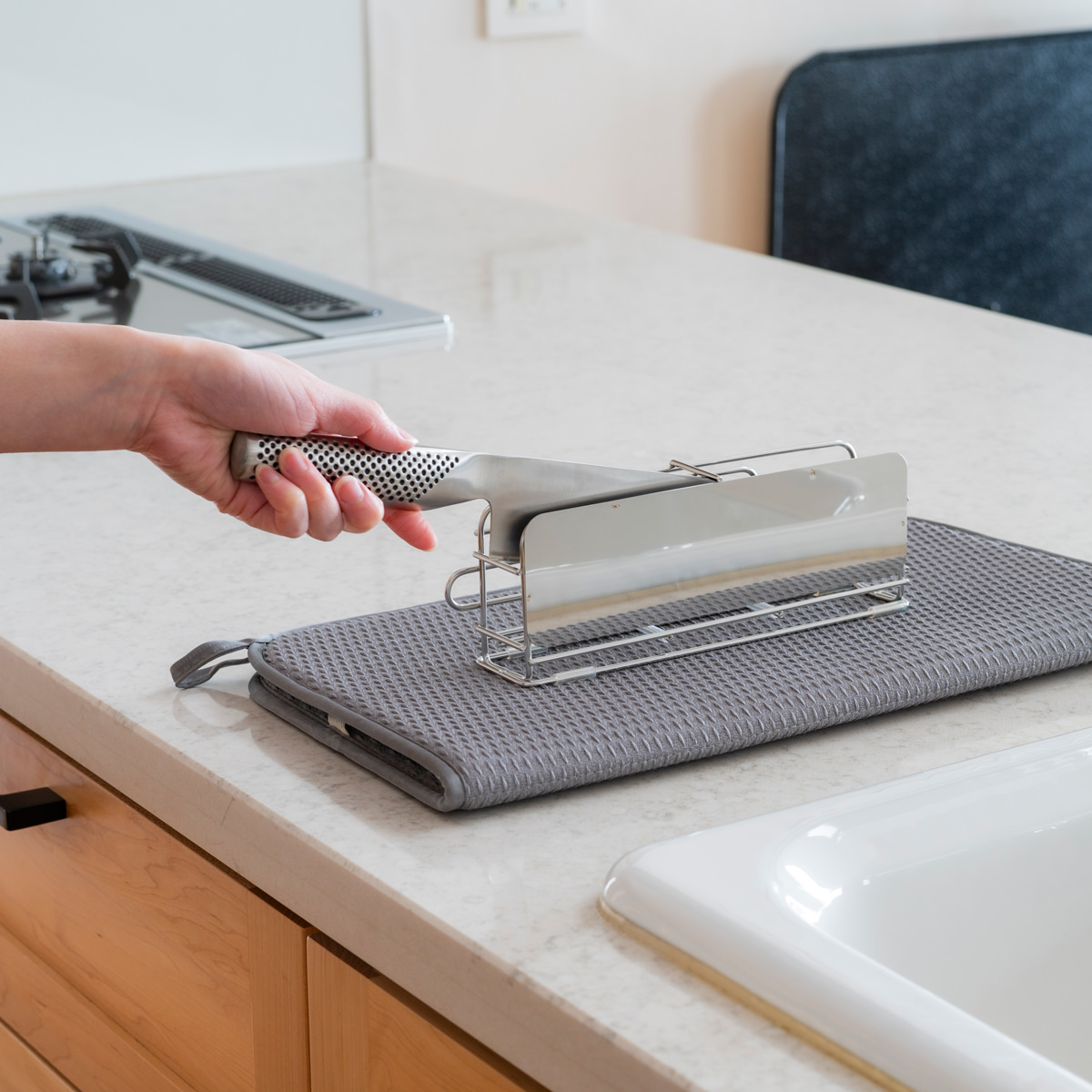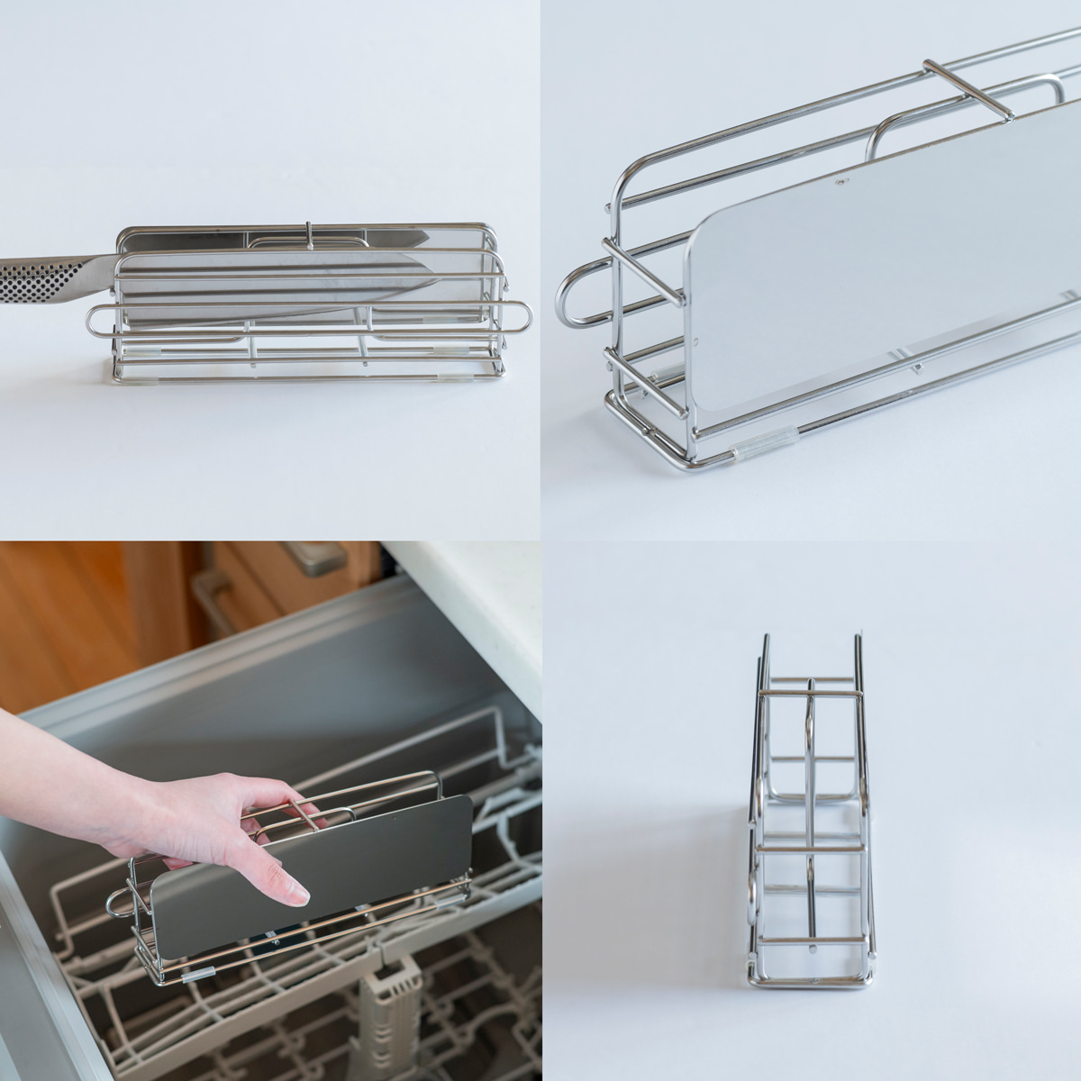 bws SELECTIONの「すっきり暮らす包丁スタンド」です。シンプルなフォルムで置き場所も取らない包丁スタンド。包丁2本を収納できます(刃渡り約12~20cmの包丁に対応)。洗った後の包丁を乱雑に水切りかごに入れてしまうと不安定で困る事はありませんか?洗った後の包丁の水切りに便利なスタンドです。テコの原理を利用し、柄の重みで刃が浮き上がる設計。左右のどちらからでも包丁を入れられます。高さ約8cmとコンパクトなので食器棚や引き出しにそのまま収納できます。包丁を入れていない時は引っ掛け収納も可能です。水切りの際は吸水タオルや吸水マットなどを下に敷いてお使いください。そのまま置いても包丁の刃が見えないように片面はステンレスの板でカバーしています。すっきり暮らすシリーズの水切りと一緒に置いても使いやすいサイズ。燕三条製の丈夫でサビに強い18-8ステンレス製。食器洗浄機対応で丸洗い可能です。※包丁によっては、刃の方が重い場合がありますが、下部に付属のクッションチューブを付けることで、傷を防げます。包丁の柄の大きさや、刃の形状により入らない場合もあります。