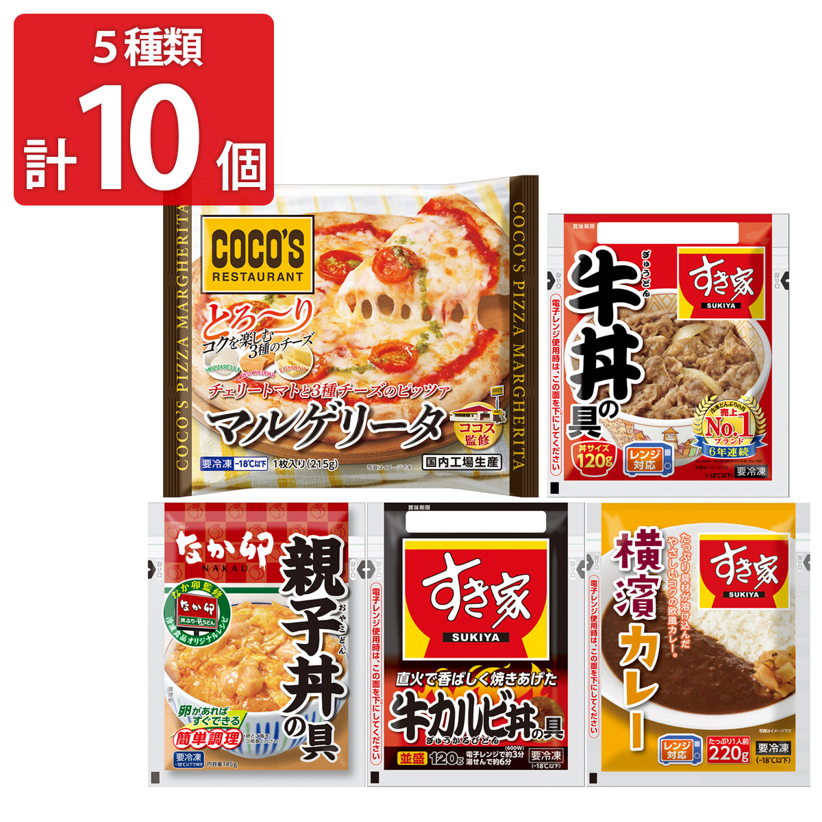 ●数量・内容:すき家牛丼の具120g、すき家牛カルビ丼の具120g、すき家横濱カレー220g、なか卯親子丼の具145g、ココス監修チェリートマトと3種チーズのピッツァマルゲリータ215g 各2
