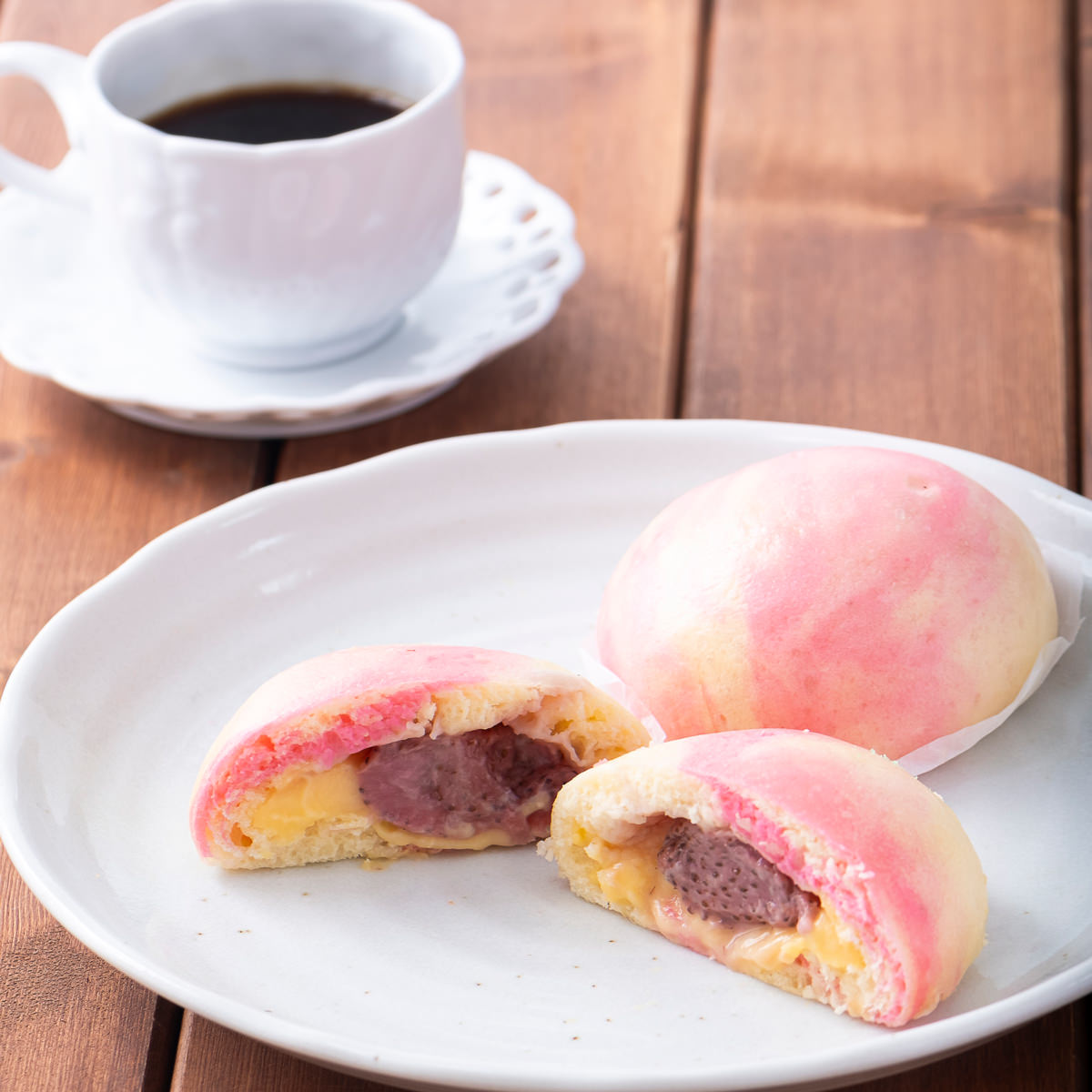 ●原材料:<苺>牛乳(愛知県)、小麦粉(愛知県製造)、苺コンポート(苺(国産)、砂糖、赤ワイン、レモン汁)、卵(愛知県)、サラダ油、カスタードパウダー、洋酒、塩/トレハロース、ドライイースト、膨張剤、赤色3号、(一部に乳成分・小麦・卵を含む)