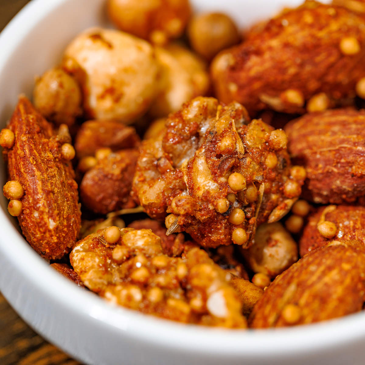 ●原材料:アーモンド(アメリカ産)、くるみ、大豆(北海道産)、へーゼルナッツ、鶏卵、マスタードシード、混合スパイス(メキシカンチリミックス(内製))、甜菜糖(北海道製造)、黒糖、食塩、蜂蜜(北海道産)、クミン、黒胡椒、タイム