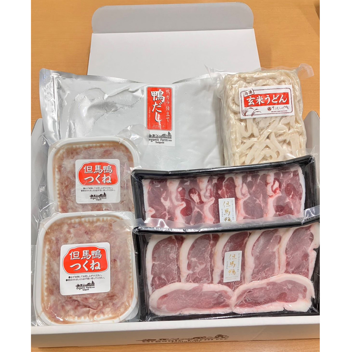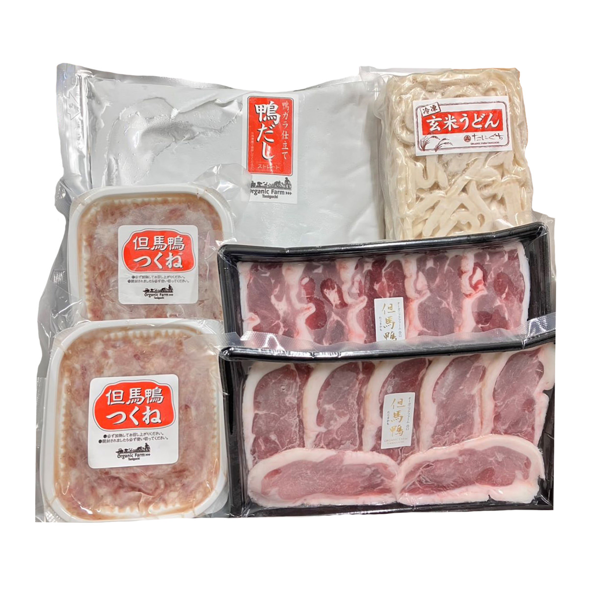 ●数量・内容:但馬鴨肉スライス100g×2、但馬鴨つくね100g×2、鴨だし1000ml×1、玄米うどん400g×1