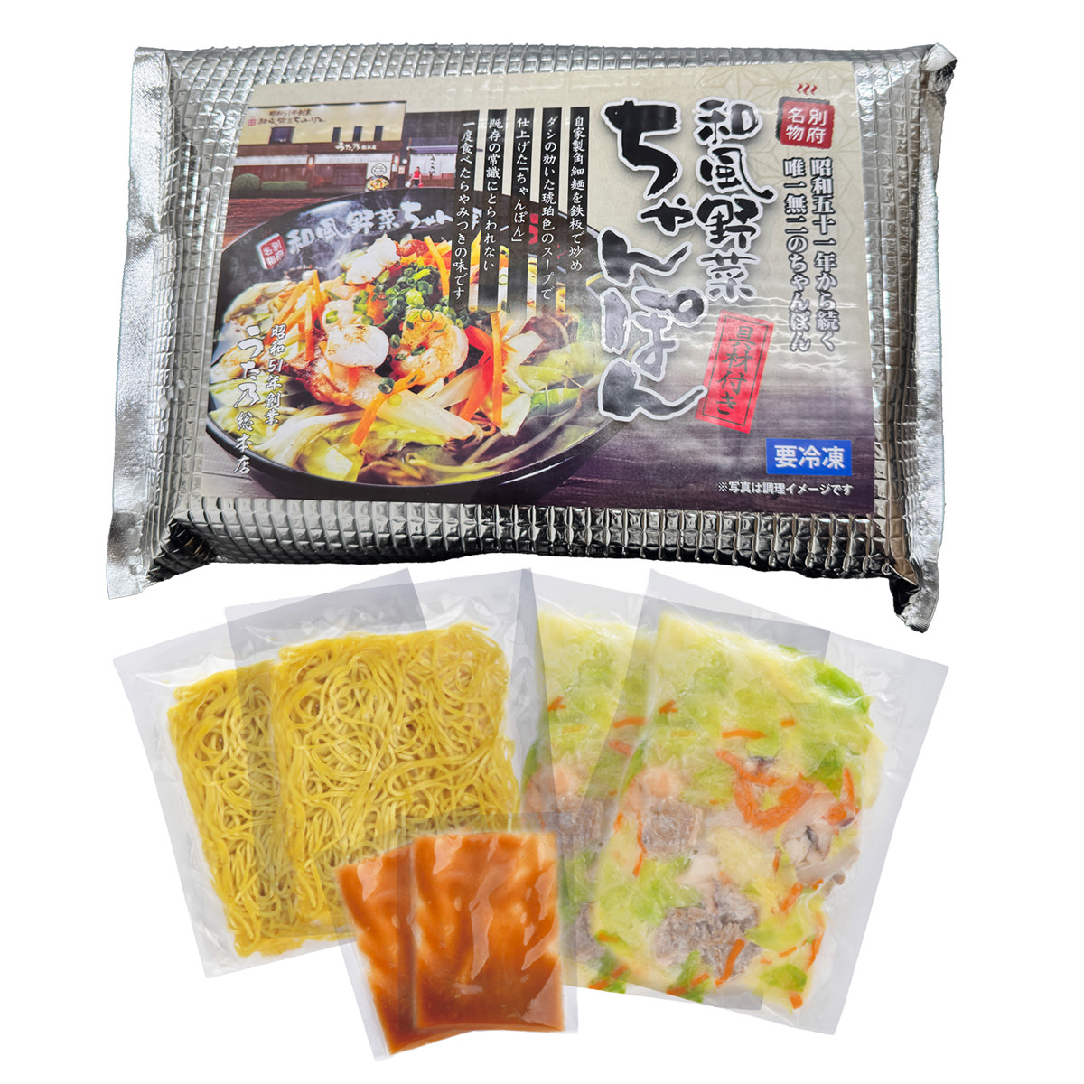 自家製の角細麺を鉄板で炒め、出汁の効いた琥珀色のスープで仕上げた「冷凍 うた乃 和風野菜ちゃんぽん」です。一度食べたらやみつきなる、大分県別府市「うた乃総本店」の看板メニュー、別府名物の和風野菜ちゃんぽんをお取り寄せでお楽しみください。お召し上がりの際は、大きめの鍋でたっぷりのお湯を沸かし、凍ったままの麺を入れ、ほぐしてすぐに湯切りします(目安1分)。熱したフライパンに少量の油をひき、麺を全体に広げて放置し、焦げ目がつくまで強火で両面を焼いてから、どんぶりに移してください。同じフライパンで具材を解凍しながら軽く炒めて麺の上にのせます。鍋に450mlの水を入れて沸騰させ、付属のスープを入れて溶かし、麺と具材にかければ出来上がりです。お好みで小ネギ、ゴマ、こしょうを入れてお召し上がりください。麺を食べた後にごはんを入れて、追いめしを楽しむのもおすすめです。