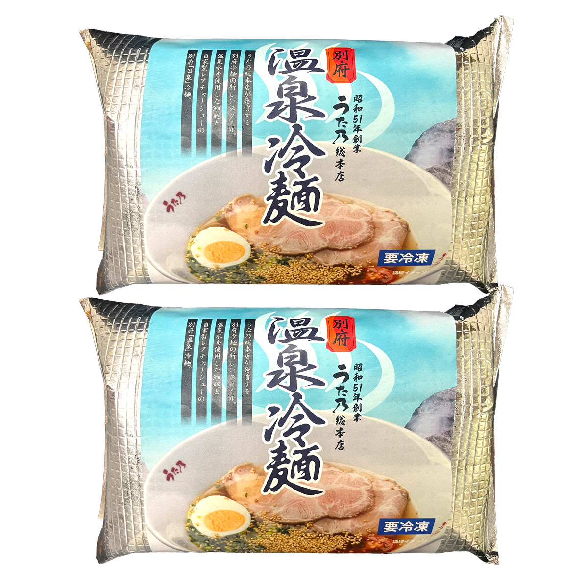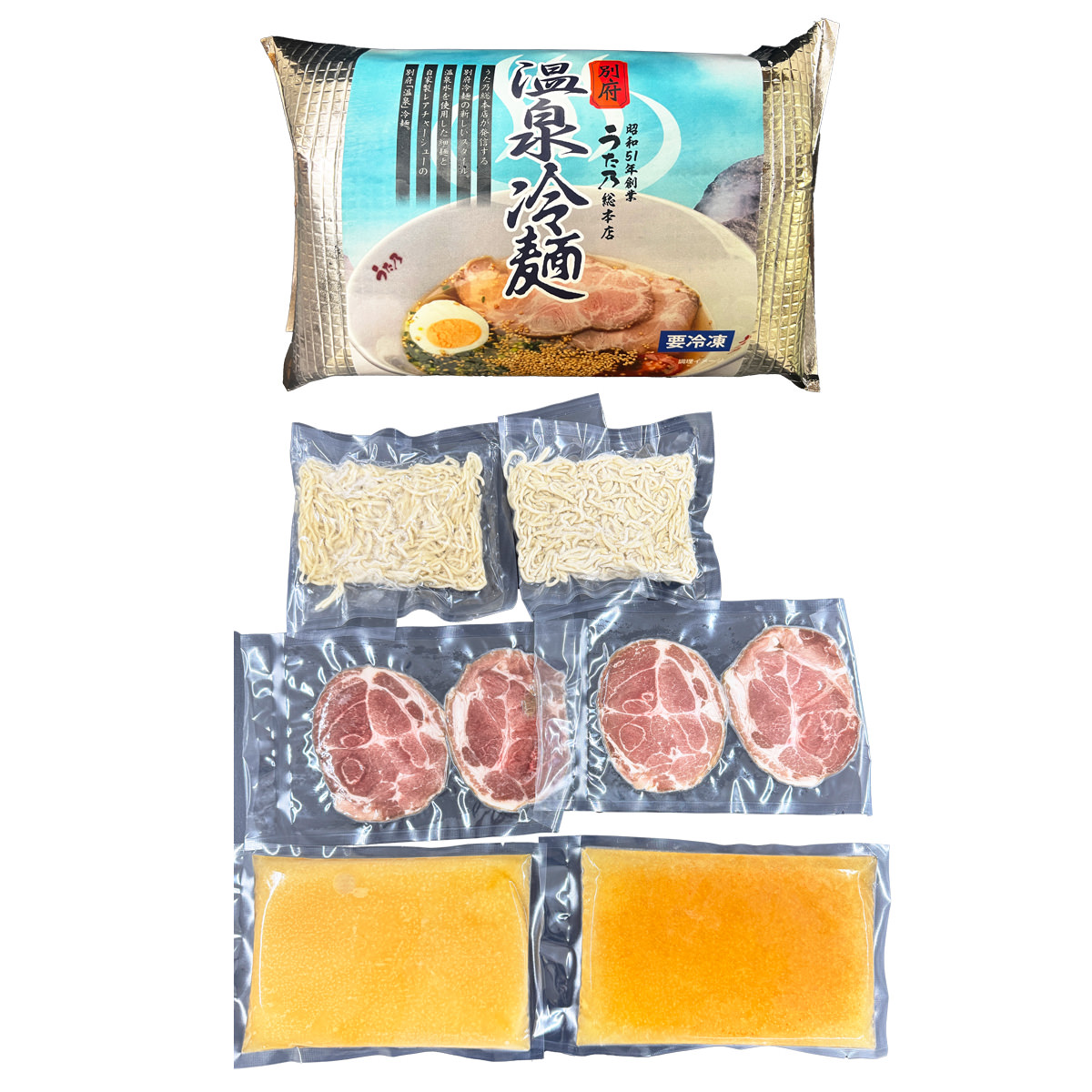 大分県別府市「うた乃総本店」がお届けする「冷凍 うた乃 別府温泉冷麺」です。麺を打つときに使う水の代わりに、別府の温泉水を使用しています。使用している温泉水はミネラルを豊富に含んでおり、麺に独特の風味とコクを与えます。配合する量・タイミング・温度等々、美味しい麺を打つために製麺技能士による試行錯誤の末、完成しました。自慢の味をお取り寄せでお楽しみください。お召し上がりの際は、大きめの鍋でたっぷりのお湯を沸かし、凍ったままの麺を入れ、ほぐして3分間茹でてください。茹で上がったら麺を湯切りし、軽く洗って氷水でしめます。どんぶりに移して付属のチャーシューをのせ、スープを注いだら完成です。スープはあらかじめ前日から冷蔵庫に移して解凍しておくか、凍った部分が少し残る程度に流水解凍しておいてください。お好みでゆで卵、小ネギ、ゴマを加えるとより美味しくお召し上がりいただけます。
