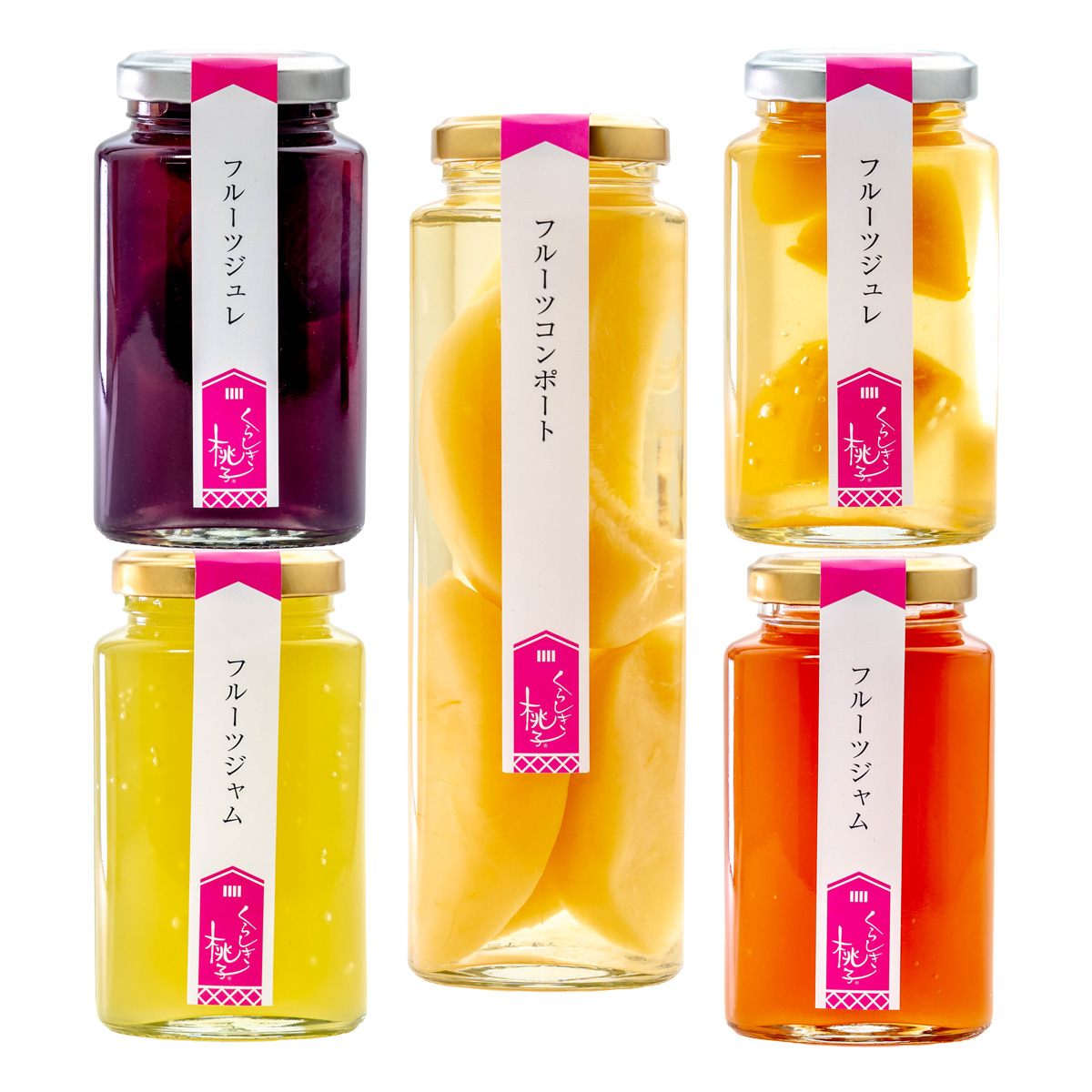 くらしき桃子の「岡山フルーツ コンポート ジュレ ジャム 5種 詰め合わせ」は、清水白桃のコンポート(シロップ漬け)、ニューピオーネ・黄金桃のジュレ、シャインマスカット・桃太郎トマトのジャムのセットです。岡山県産のフルーツを旬の時期に収穫し、スイーツに仕上げました。おやつ、デザート、パンのおとも、ヨーグルトやアイスクリームのトッピングなどにご利用ください。限られた時期にしか味わえない美味しさをいつでもお好きな時に愉しめる、ギフトにもおすすめのアソートです。<フルーツコンポート(清水白桃)>旬の時期に収穫した岡山県産清水白桃の緻密な果肉、とろけるような食感を楽しめます。<フルーツジュレ2種>岡山特産のニューピオーネ、黄金桃をそれぞれ使用。<フルーツジャム2種>岡山特産のシャインマスカット、桃太郎トマトをそれぞれ使用。素材の風味を大切に無香料・無着色・低糖度(40度)で仕上げました。