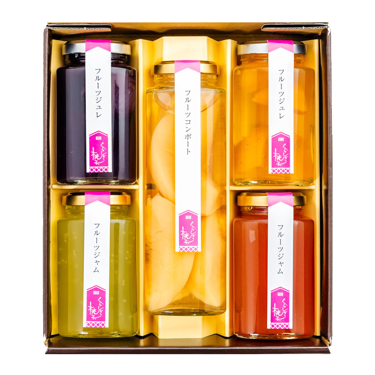 ●数量・内容:フルーツコンポート清水白桃200g、フルーツジュレ(ニューピオーネ、黄金桃) 各110g、フルーツジャム(シャインマスカット、桃太郎トマト) 各125g