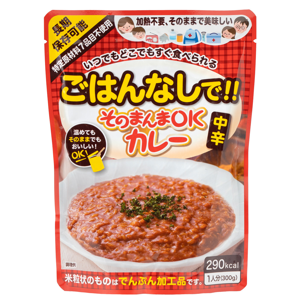 「長期保存 レトルト そのまんまOKカレー 中辛」は、開封するだけでカレーライスのように食べられる「お水不要」「熱源不要」「待ち時間不要」の、ご飯入り(でんぷん)カレーです。特定原材料不使用、常温で美味しく食べられるように動物性油脂を使用しておらず、開封するだけで食事が出来ます。「石川県バリアフリー社会推進賞(2020年)」「災害食大賞2019 旨み部門金賞」などを受賞しております。温めて召し上がる際は、レトルトパウチの封を切らずに、熱湯の中に入れ、4~6分沸騰させて湯せんしてください。電子レンジを使用する場合はレトルトパウチを開封し、中身を深めの器に移し替えてラップをかけて加熱してください。500Wの場合2分、600Wの場合1分30秒が目安です。