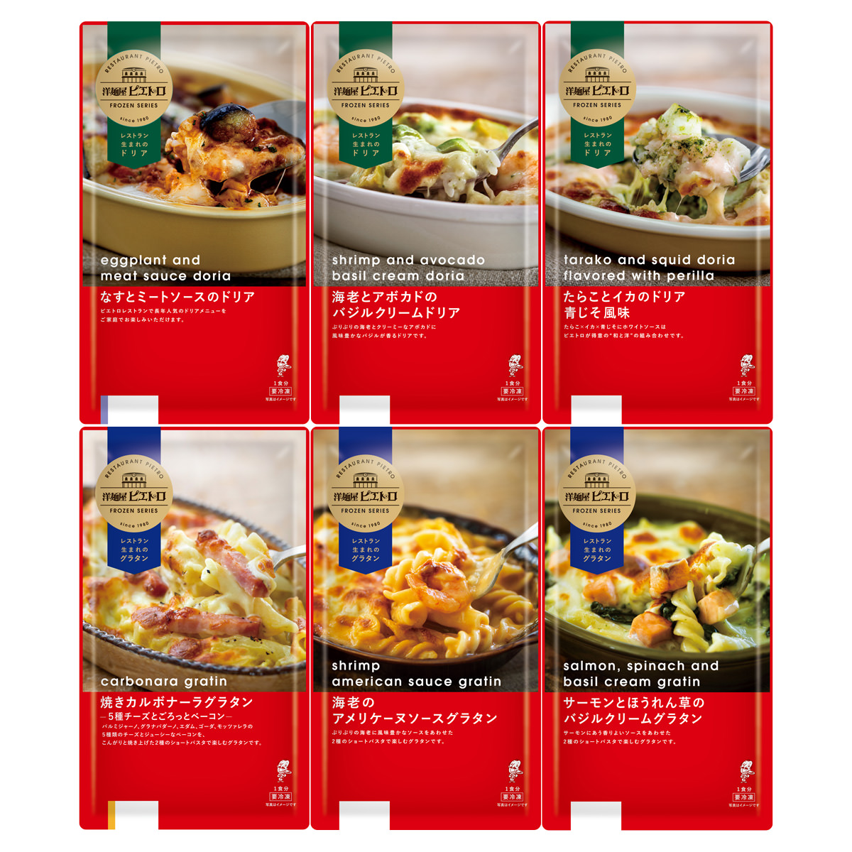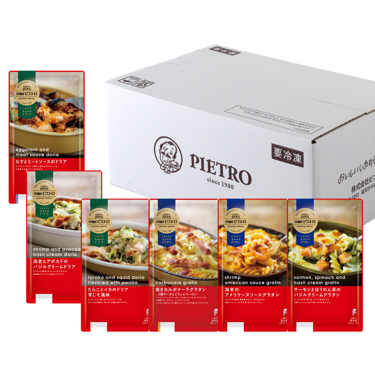 ピエトロのドリア・グラタンのセット。ピエトロのはじまりは1980年に福岡・天神にオープンした一軒のレストラン。そのおいしさをご家庭にお届けいたします。<なすとミートソースのドリア>ピエトロレストランで長年人気。<海老とアボカドのバジルクリームドリア>ぷりぷりの海老とクリーミーなアボカドに風味豊かなバジルが香るドリア。<たらことイカのドリア>たらこ×イカ×青じそにホワイトソースはピエトロが得意の“和と洋”の組み合わせ。<焼きカルボナーラグラタン>5種類のチーズとジューシーなベーコンをこんがりと焼き上げた2種のショートパスタで楽しむグラタン。<海老のアメリケーヌソースグラタン>ぷりぷりの海老に風味豊かなソースをあわせた、2種のショートパスタで楽しむグラタン。<サーモンとほうれん草のバジルクリームグラタン>サーモンにあう香りよいソースをあわせた、2種のショートパスタで楽しむグラタン。