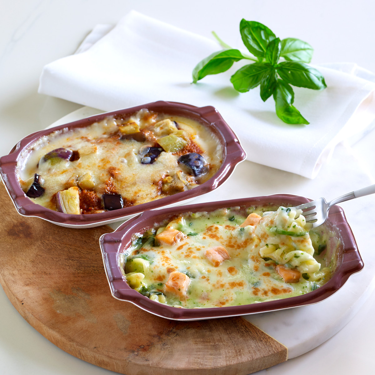 <サーモンとほうれん草のバジルクリームグラタン>ホワイトソース(国内製造)、マカロニ(フジッリ、ペンネリーチェ)、ほうれん草(国産)、ナチュラルチーズ、アトランティックサーモン(ノルウェー産)、バジルソース、ワイン、食用植物油脂、食塩、昆布茶、ブラックペッパー/調味料(アミノ酸等)、(一部に乳成分・小麦・さけ・大豆・鶏肉を含む)