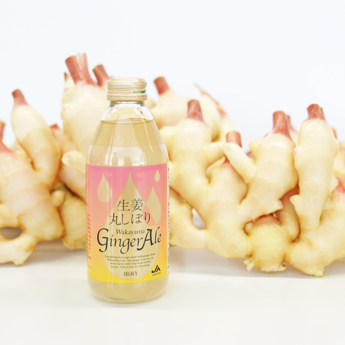 「生姜丸しぼり Wakayama ジンジャーエール」は、全国有数の新生姜の特産地である和歌山市産の生姜をふんだんに使用し、丸しぼりしたジンジャーエールです。丸しぼりだからこその、生姜特有のピリッとした喉越しと風味を存分に感じていただけます。口あたりが良く、後味はスッキリとしていて爽やかです。冷たくひやしてそのままお飲みいただくほか、ビールやウォッカ・ウイスキー等アルコールの割り材としてもお楽しみいただけます。本品は、JAわかやまと和歌山商工会議所との農商工連携で開発された商品です。