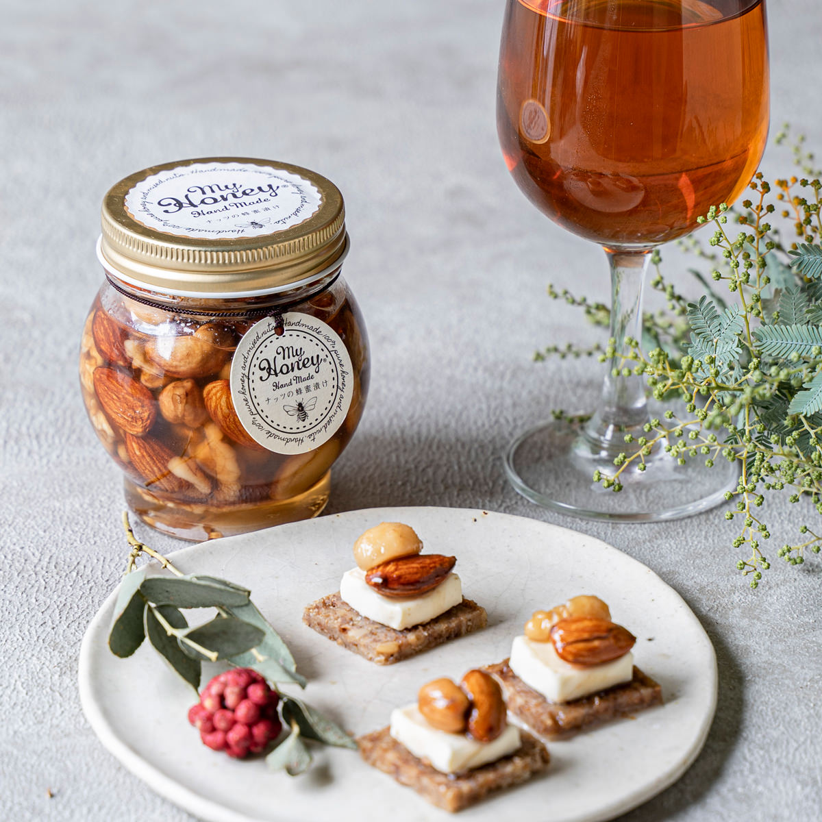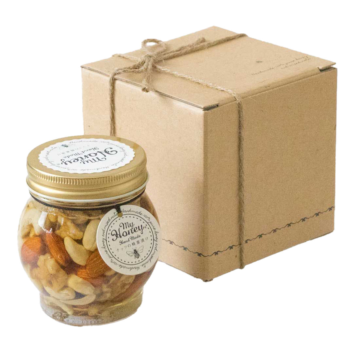 生はちみつ専門店”MYHONEY(マイハニー)”がお届けする「ナッツの蜂蜜漬け」です。「毎日食べても、飽きないハチミツ」にこだわった製法で、ひとつひとつ丁寧に手づくりしています。とろりとした、ほどよい甘さのハチミツと、ミックスナッツの歯ごたえがクセになる美味しさです。ナッツはアーモンド、カシューナッツ、くるみ、マカダミアナッツを使用。アメリカをはじめとした世界中から厳選した良品を、焙煎職人が手作業で仕込んでいます。ハチミツは、国内で流通が少ない、希少なハンガリー産を使用。世界中から厳選した良品をひとつひとつ、「ていねいに。」を合言葉に、ハンドメイドで製造しています。食卓に並べてもおしゃれに見える瓶入りの「ナッツの蜂蜜漬け」は、プレゼントにもおすすめです。化粧箱に入れてお届けします。※1歳未満のお子様には与えないでください。{食べ方}そのまま食べるほか、朝食のヨーグルトにトッピングする、またはトーストやパンケーキにのせてお召し上がりいただくのがおすすめです。お料理や手作りスイーツなどにもご活用ください。