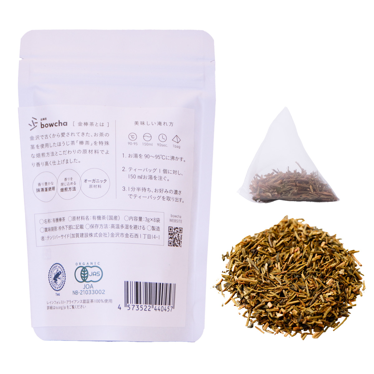 Tea Roastery Tenの「加賀棒ほうじ茶 金棒茶 bowcha ティーバッグ」は、オーガニック認証を受けた茎のみを焙煎した、深煎りの棒ほうじ茶です。抹茶の原料となる碾茶の茎を使用したことで、香り高く苦みの少ない、甘くて優しい味わいとなっています。ホットでもアイスでも美味しくお飲みいただけます。スッキリとなめらかで渋みがなく、自然な甘い香りを楽しめるお茶です。お好みの濃さでお茶を淹れてお楽しみください。カラフルでポップなデザインのパッケージにお入れしています。お土産やプレゼントなどにもおすすめです。【有機JAS認証】JOA NB-21033002{美味しい入れ方}<HOT1杯分(150ml)>(1)ティーバッグ1個に対し、お湯(90~95℃)150mlを注ぐ。(2)1分30秒~2分待ち、ティーバッグを取り出す。<ICE2杯分(300ml)>(1)ティーバッグ2個に対し、お湯(90~95℃)150mlを注ぐ。(2)2~3分待ち、氷150gを入れて混ぜる。