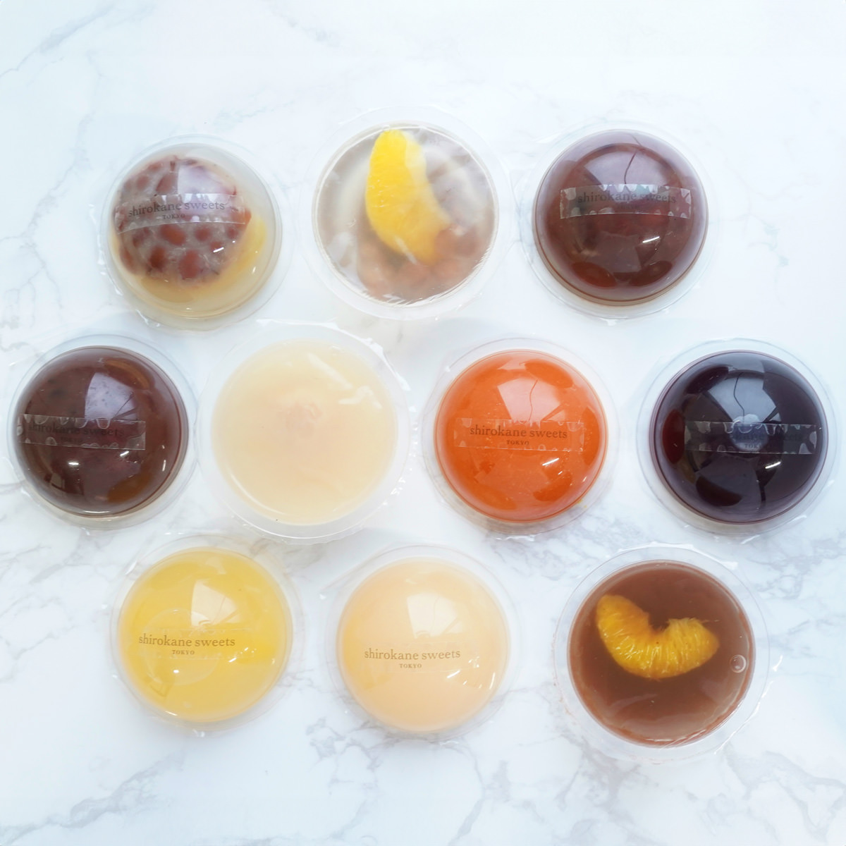 ●数量・内容:ブラッドオレンジゼリー、桃ゼリー、ライチゼリー、林檎ゼリー、葡萄ゼリー、フルーツ水ようかんオレンジ、フルーツ水ようかん桃、フルーツ水ようかん苺、フルーツあんみつオレンジ、フルーツあんみつ桃 各65ml