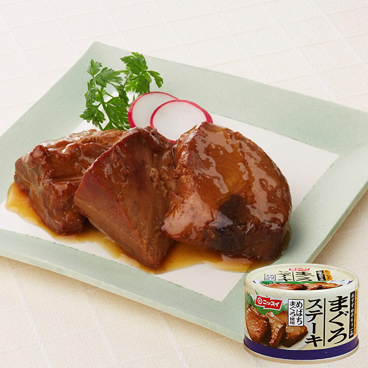 「ニッスイ まぐろステーキ 缶詰」は、醤油ベースのステーキソースが美味しい、あっさりした赤身ステーキです。めばちまぐろを丁寧にスライスしました。日本人の大好きなマグロ(鮪)といえば、流通量の多い「めばちまぐろ」がポピュラーです。その美味しいまぐろのステーキをいつでも好きな時にお召し上がりいただけます。お箸が進む味付けですので、魚が苦手な方でもパクパク食べられます。ご飯との相性も良く、朝食、夕食のおかずの一品などにおすすめです。お弁当のおかずや、お酒のおつまみなどにもどうぞ。缶切り不要のプルトップ式ですので、簡単に開封できます。調理の時間が無いときにも重宝します。長期間、常温保存可能な缶詰は、日常のストックのほか、非常食、保存食、防災備蓄品などとして常備しておくと便利です。キャンプやアウトドアのお供にもおすすめ。
