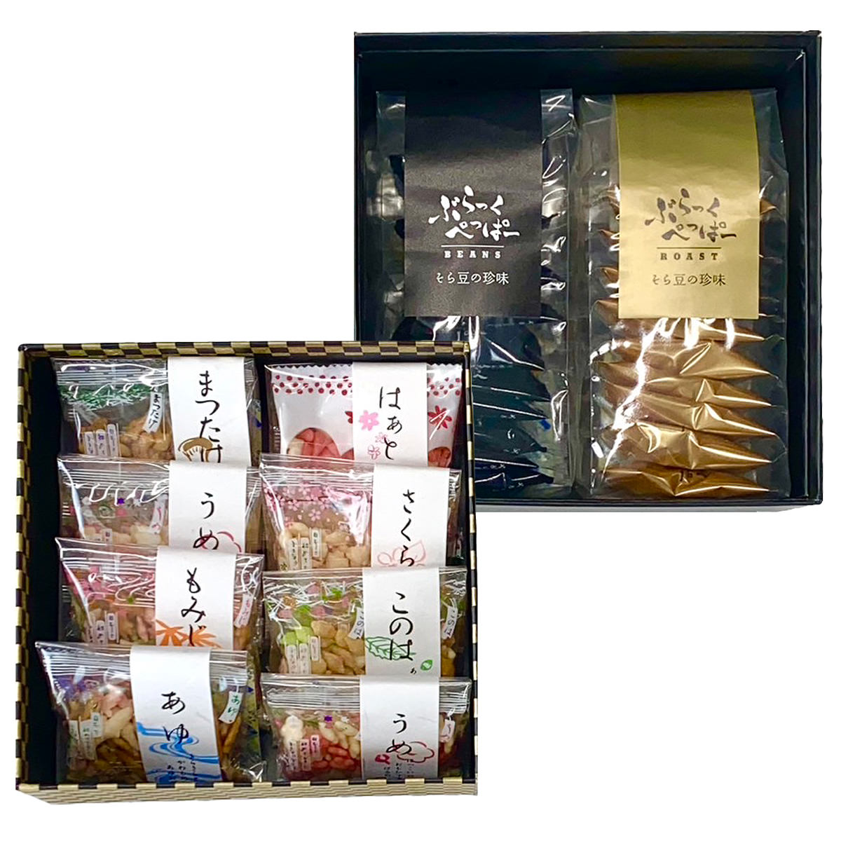 ●数量・内容:(うめ×2、あゆ×1、もみじ×1、このは×1、まつたけ×1、さくら×1、はぁと×1) 各1袋あたり小袋3個入、(ぶらっくぺっぱーBEANS、ぶらっくぺっぱーROAST) 各11個入